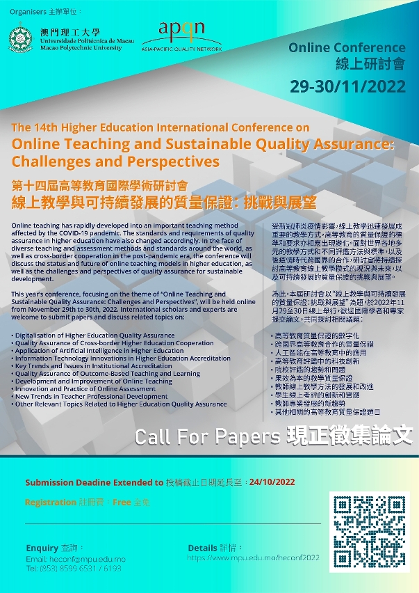 The Macao Polytechnic University (MPU) and the Asia-Pacific Quality Network (APQN) are jointly organising “The 14th Higher Education International Conference on Online Teaching and Sustainable Quality Assurance: Challenges and Perspectives”, with the call for papers until October 24th. Experts and scholars of higher education in Macao and around the world are cordially invited to participate and publish papers in related fields. The conference aims to continuously enhance the quality of teaching and learning in higher education as well as to strengthen the cooperation between Macao and overseas higher education institutions, and explores the challenges and perspectives of sustainable online teaching and quality assurance in higher education in the post-pandemic era.