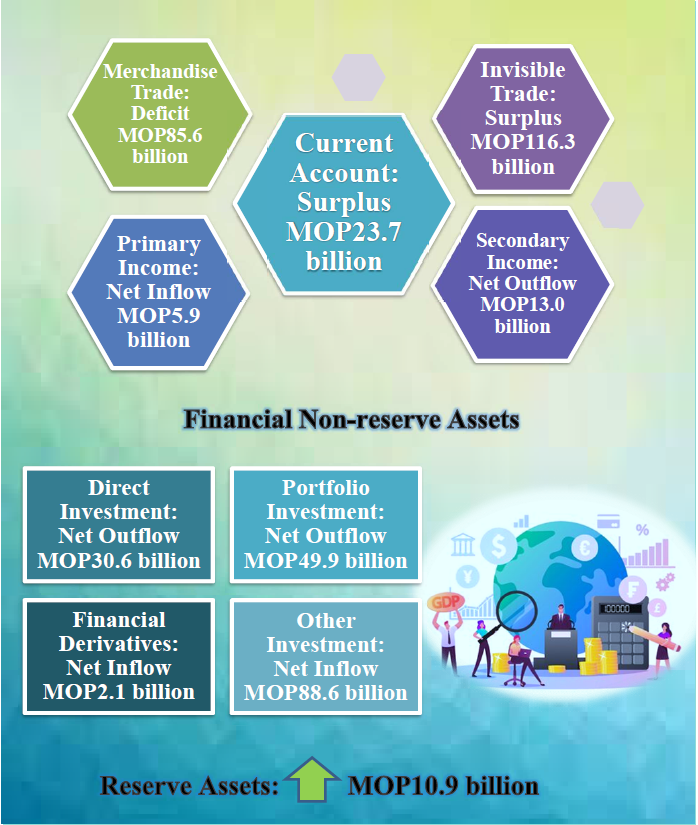 In 2021, the overall BOP of Macao SAR preliminarily recorded a surplus of MOP10.9 billion. Of which, the current account registered a surplus of MOP23.7 billion and financial non-reserve assets showed a net decrease of MOP10.1 billion.