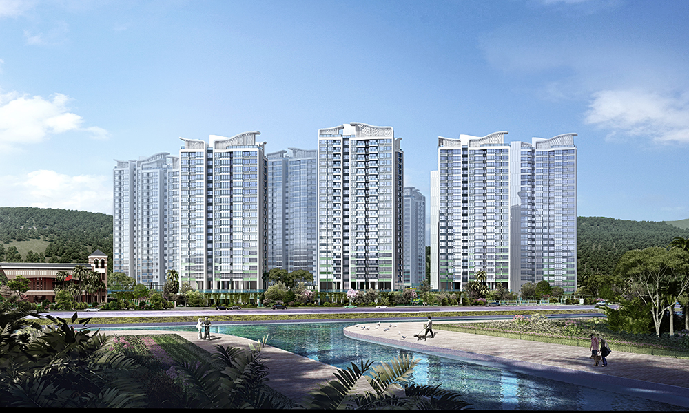 The project has Xiao Hengqin Mountain as the backdrop and faces Tianmu River, creating a living environment where nature is brought into the city. The 27 residential buildings are of 19 to 26 floors, a typical floor will have seven to eight units, and altogether the project can provide about 4,000 residential units and over 200 housing units for talents. Two-bedroom units account for 80 percent of the project and the remaining are three-bedroom units.
