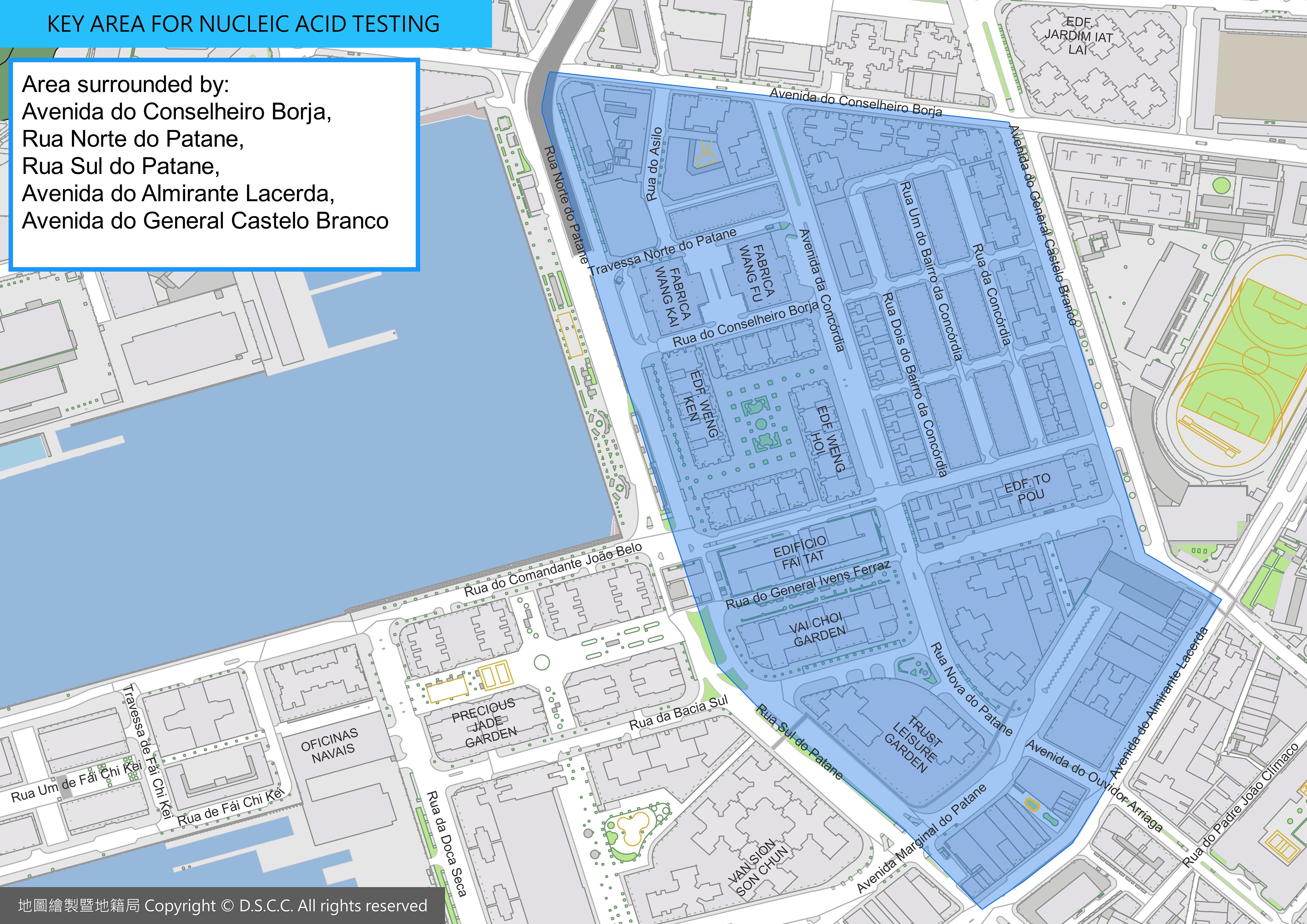 The Novel Coronavirus Response and Coordination Centre received a report from Zhuhai health authorities this morning (26 October) that a tube of 10-in-1 mixed sample, involving 8 people in Macao, has been tested positive. The Response and Coordination Centre immediately activated the emergency response mechanism and arranged for the 8 people concerned to undergo individual testing. Among them, a 66-year-old female Macao resident was found positive for COVID-19. The place where she lives – Edf. Weng Heng, No. 7 & 8 Rua Um do Bairro da Concórdia – has been classified as red-coded zone. For this reason, a nucleic acid testing drive will be launched at 16:00 on 26 October for the area which the positive case frequent, so as to identify any potential infected persons who may be lurking in the local community. Nucleic acid testing must be done once daily on 26, 27 and 28 October for individuals in the following key area: