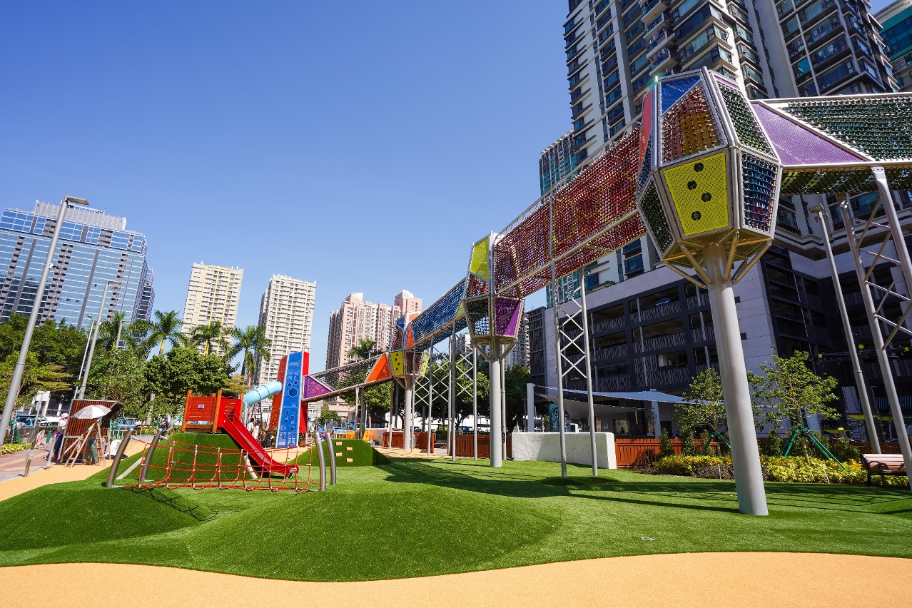 Innovative play facilities are introduced to the children’s playground, including the first outdoor sandpit in Macao Peninsula that would create an environment for mutual assistance and carefree amusement with peers, so that children can easily enjoy the fun of sand and water in the community, and show their creativity in building games with sands. To ensure the safety of young children, those under the age of five must be accompanied by their parents to enter the sandpit. Meanwhile, to control crowds at the early stage after the opening, appointment is required for entering the sandpit. Besides the daily check and cleaning before opening, the sandpit will be closed for maintenance once a month to ensure its quality. There are also a slide area, artificial grass hills and other parent-child play equipment in the playground divided into different zones by age and suitable for children aged 3 to 12 to practise physical coordination and balance. Another group of moderately challenging high-rise play facilities with climbing elements allows older children to learn how to play safely and exercise their physical fitness in the game. IAM has arranged for personnel to maintain order in the playground. Parents and children are advised to follow their instructions and pay attention to safety.