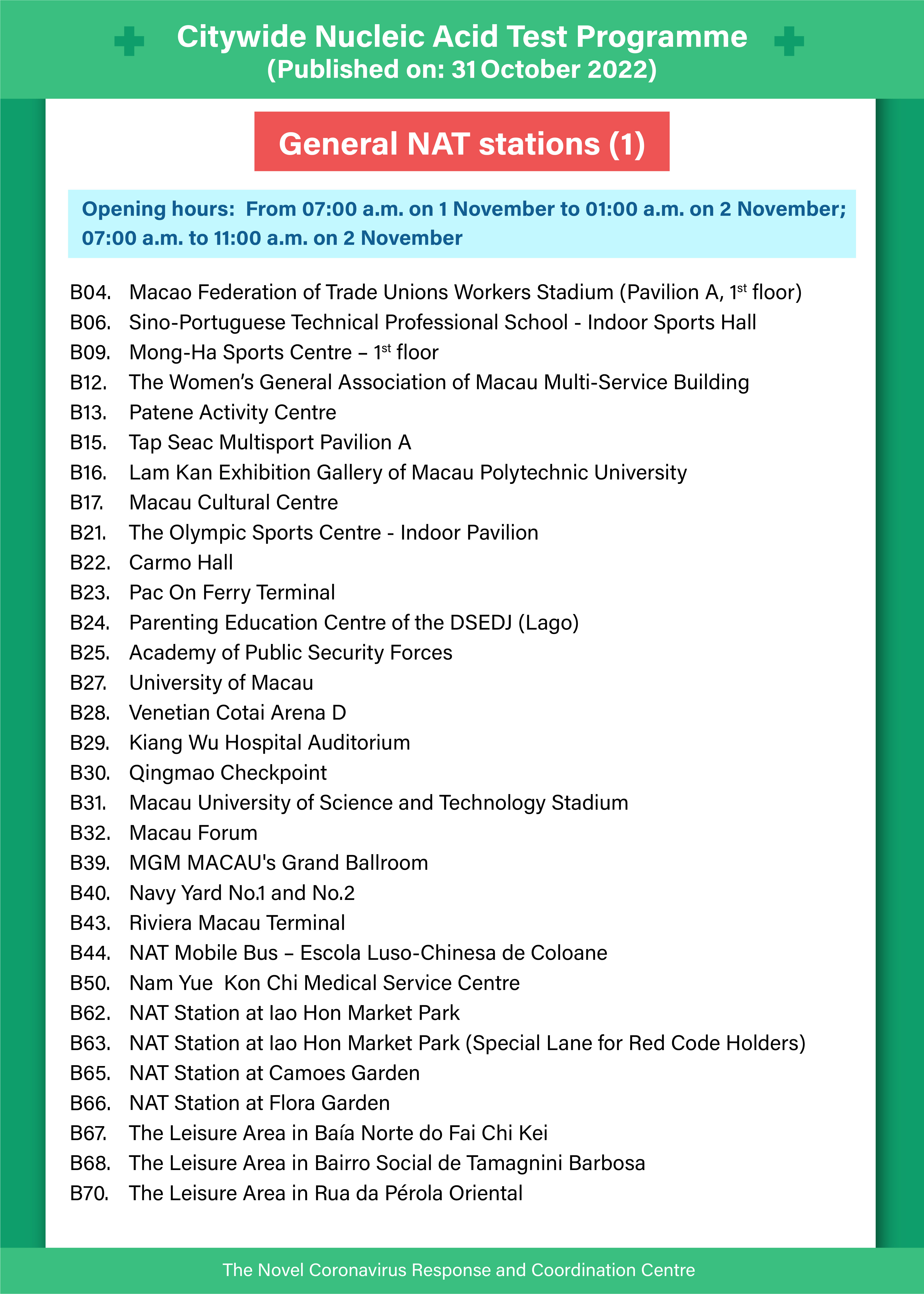 - The appointment system will be put into operation from 21:00 on 31 October. Free test booking link (result cannot be used for border-crossing purposes): https://eservice.ssm.gov.mo/allpeoplernatestbook.