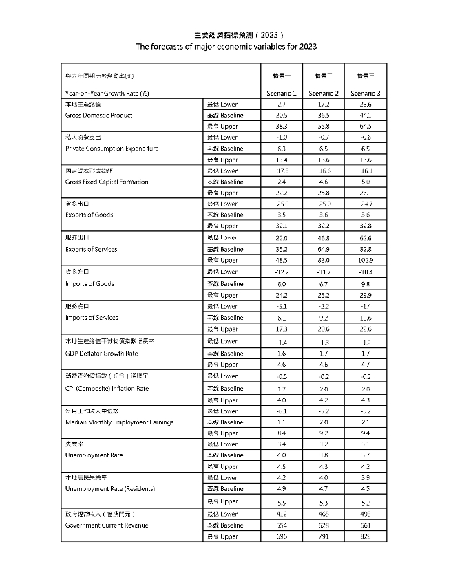 - The baseline forecast of GDP growths are 20.5%, to MOP 211.8 billion (47.7% of 2019’s level), in Scenario 1; 36.5%, to MOP 240 billion (54.0% of 2019’s level), in Scenario 2; and 44.1%, to MOP 253.3 billion (67.0% of 2019’s level), in Scenario 3, respectively.