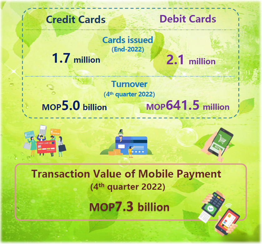 For the fourth quarter of 2022, the credit card turnover totalled MOP5.0 billion, a growth of 11.7% from the previous quarter. The cash advance turnover was MOP141.8 million, occupying 2.8% of total credit card turnover. The number of credit card transactions reached 7.8 million, up 13.3% on a quarterly basis. Credit card repayments, in which payments for interest and fees are included, rose quarter-to-quarter by 18.4% to MOP5.3 billion. Meanwhile, the number of debit card transactions other than cash withdrawals grew 8.2% to 326.6 thousand. The debit card turnover increased 0.7% from the third quarter to MOP641.5 million.