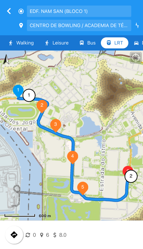 The route planning function in the new version of "Macau GeoGuide" provides five travel route schemes, i.e., shortest walking, leisure, bus, LRT and driving, which take various users’ traveling needs into account. The newly added LRT route scheme not only assists user to find the appropriate LRT stations near the starting and ending point, but also integrates results of walking and bus interchange, provides information such as walking path, LRT or bus boarding station, passing-by station, get-off station, number of interchanges, number of stations travelled and fares, etc.