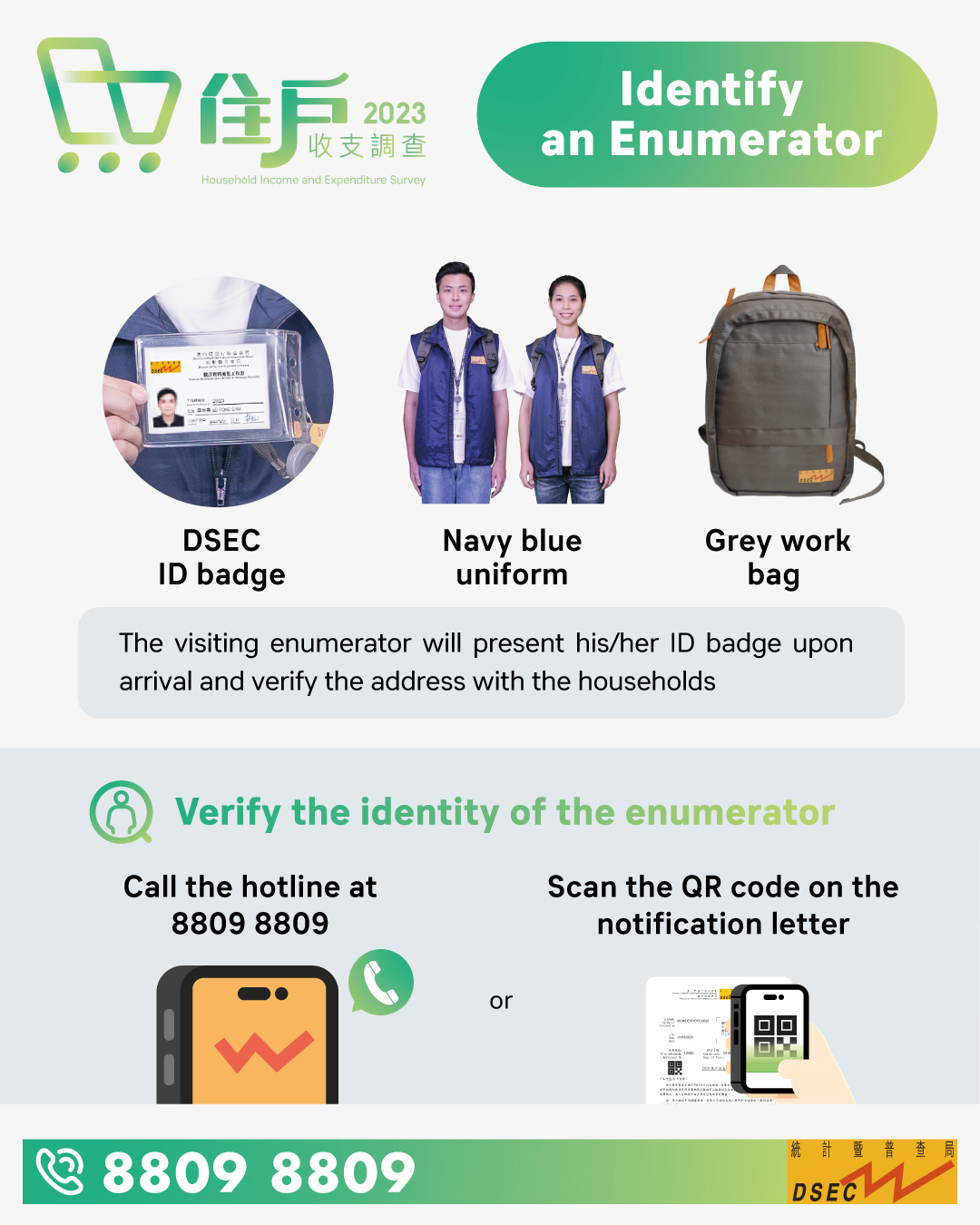 Households may also provide information via a face-to-face interview with an enumerator by calling the hotline at 8809 8809 to arrange an appointment. The visiting enumerator, who wears a navy blue uniform bearing the DSEC logo and carries a grey work bag, will present his or her ID badge upon arrival and verify the address with the household. If necessary, households may view or verify the identity of the enumerator by scanning the QR code on the notification letter or by calling the hotline at 8809 8809.