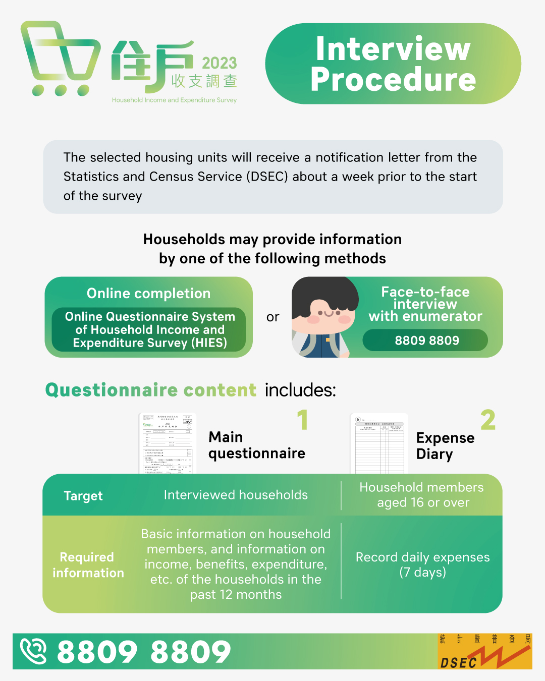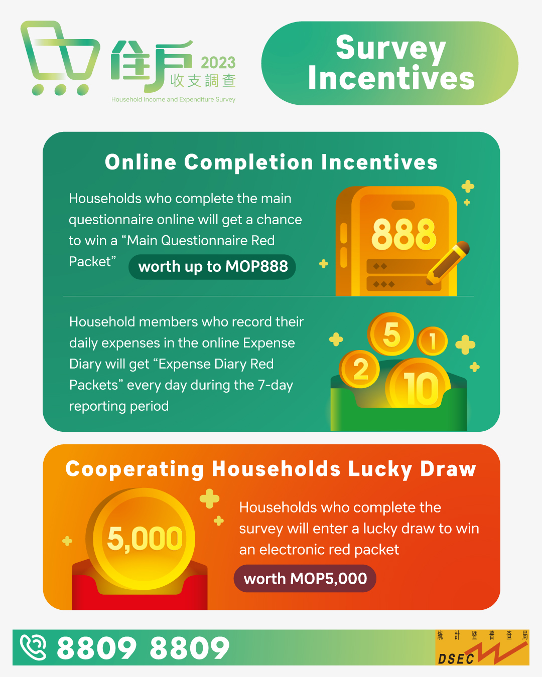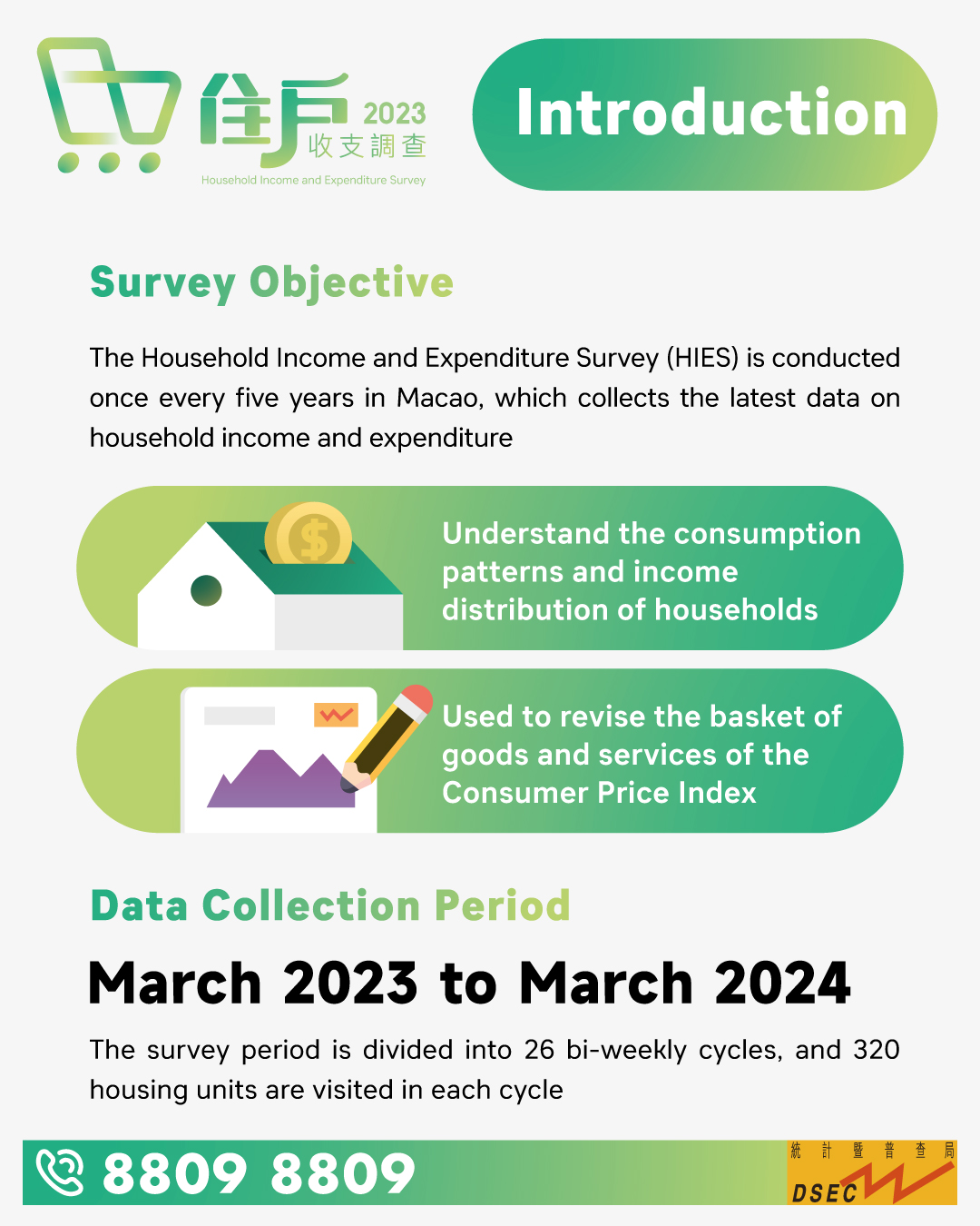 For more information about the HIES 2023, please visit the survey website at (https://www.dsec.gov.mo/IDRF2023) or call the hotline at 8809 8809.