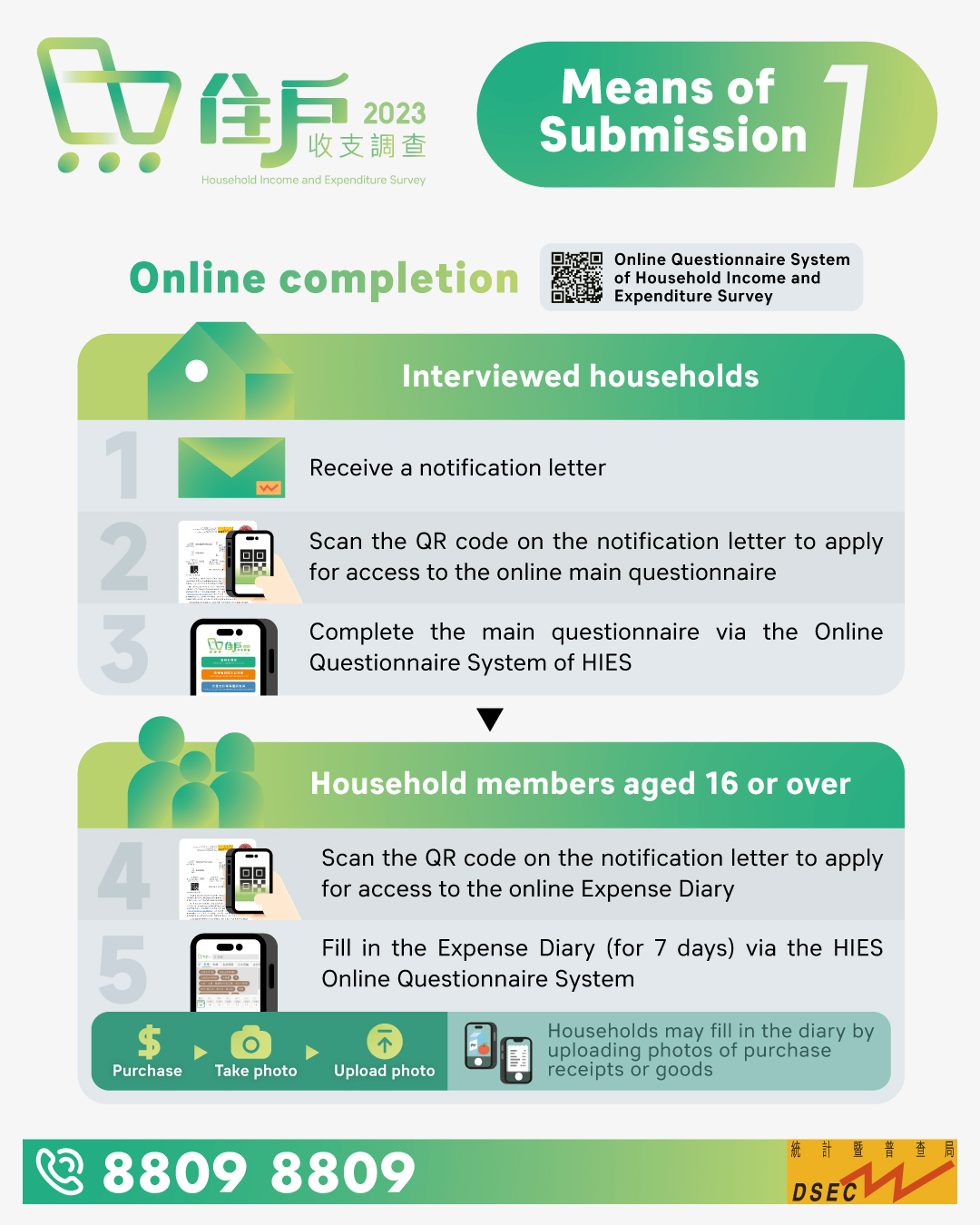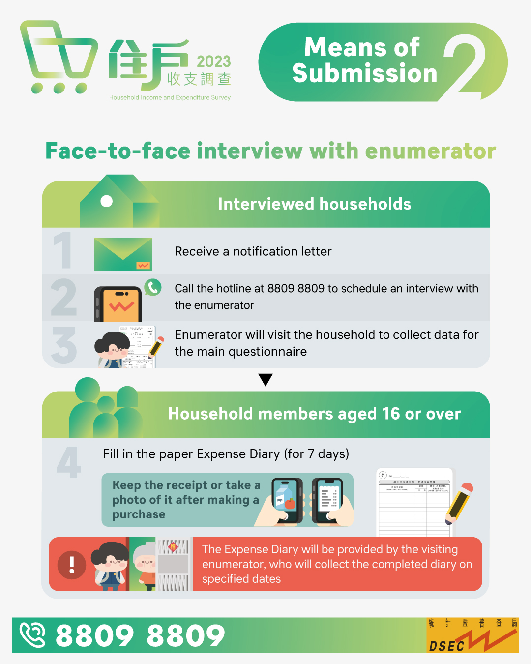 Regardless of data submission method, every selected household has to complete 1 main questionnaire, providing information on housing characteristics, basic characteristics of household members, and income and expenditure of the household. In addition, each household member aged 16 or over has to complete an Expense Diary, recording details of their expenses for 7 consecutive days.