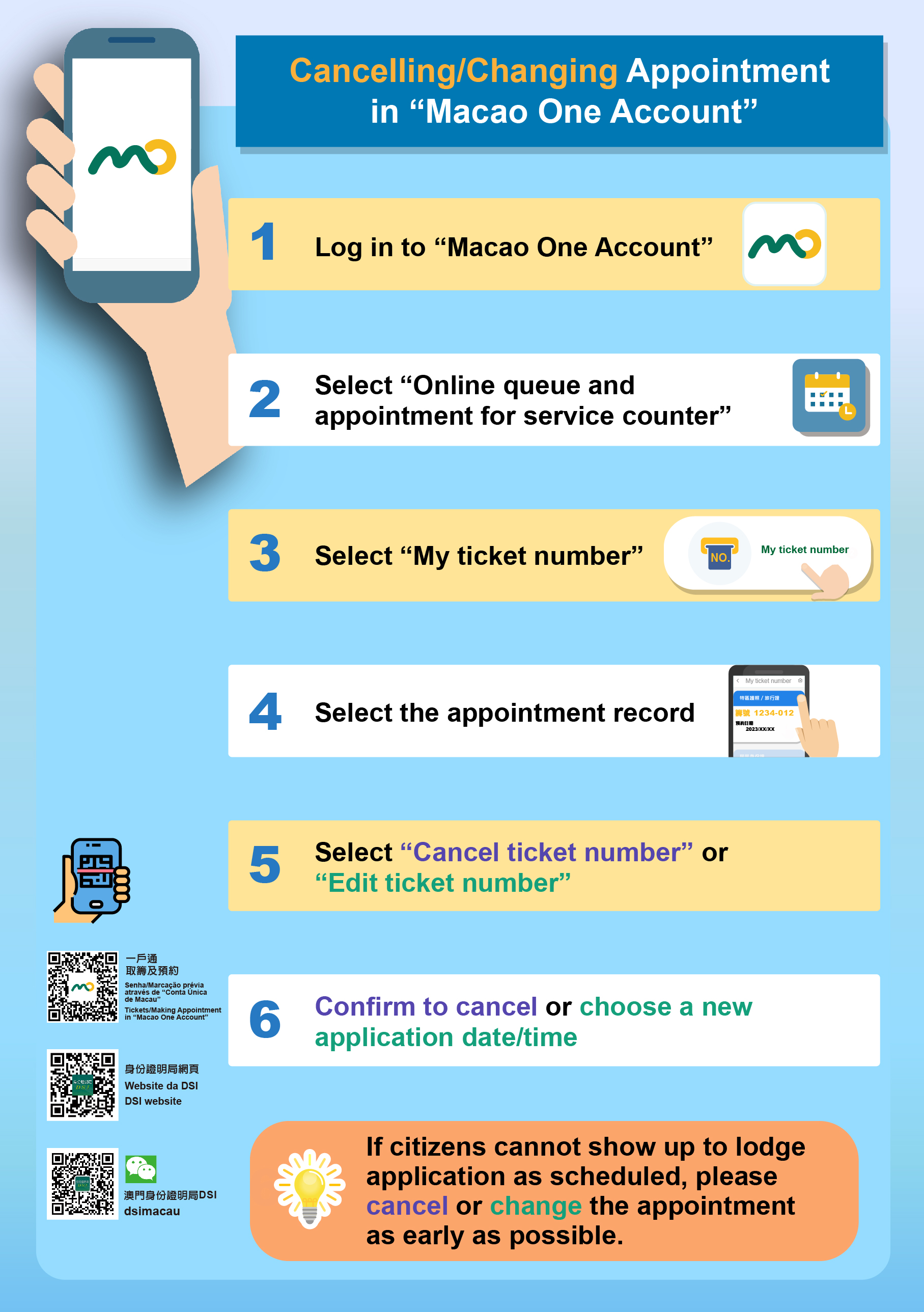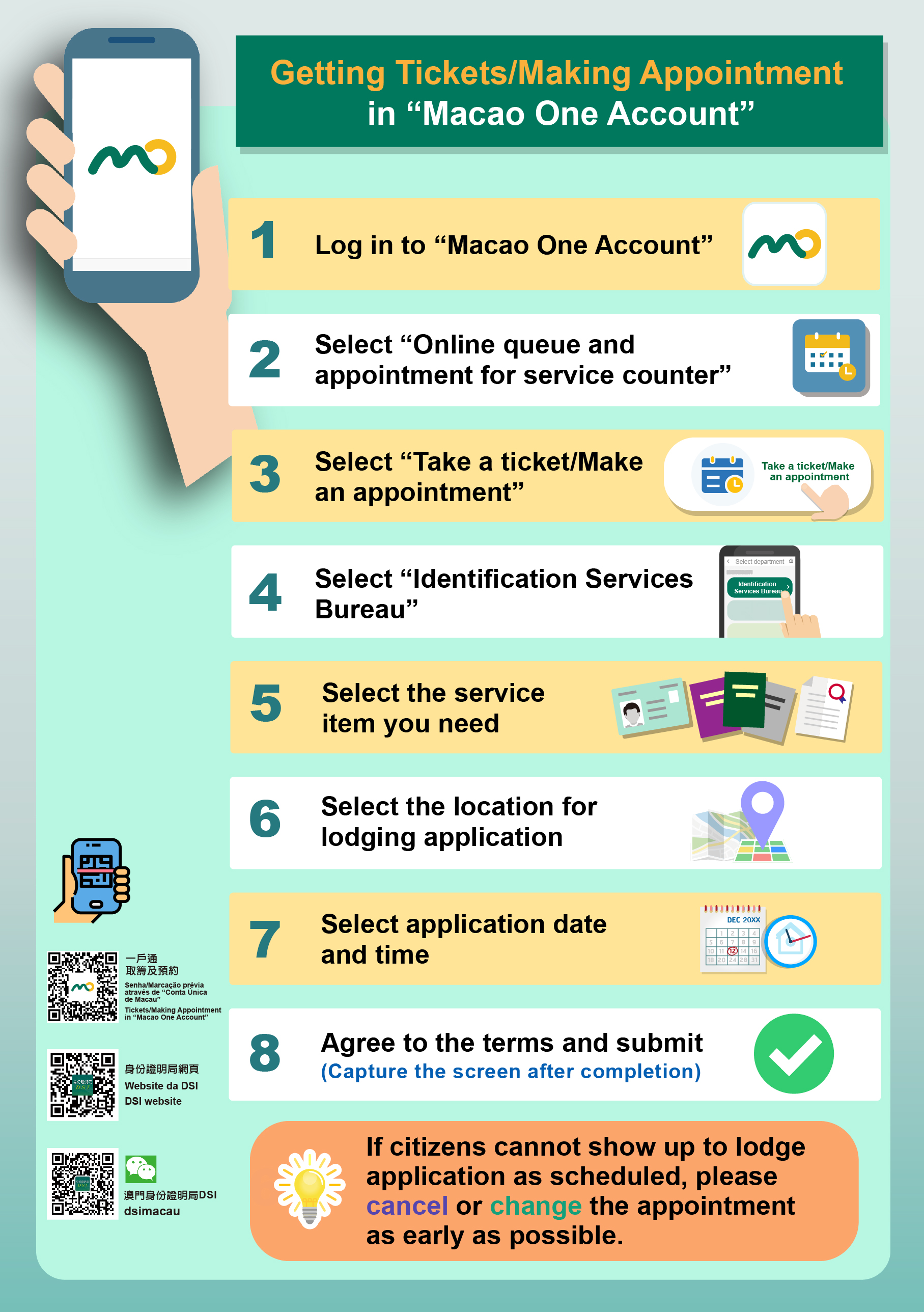Citizens can make appointment for counter services in “Ticketing and Appointment for Counter Service” in “Macao One Account” or on DSI website ( www.dsi.gov.mo ). On-site ticketing will not be provided during the extended hours, but citizens can collect documents without appointment during that time. If citizens cannot show up as scheduled, they can cancel or change their appointment through “Macao One Account” or on DSI website to release the quotas for other citizens.