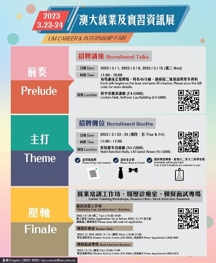The two-day fair will be held in Room G008 of the UM Guest House (N1), from 11:00am to 5:00pm (last entry at 4:30pm). UM students and alumni who are attending the event are welcome to bring their personal information and wear formal attire for job applications. For enquiries, please call 8822 4839 or email sao.career@um.edu.mo.