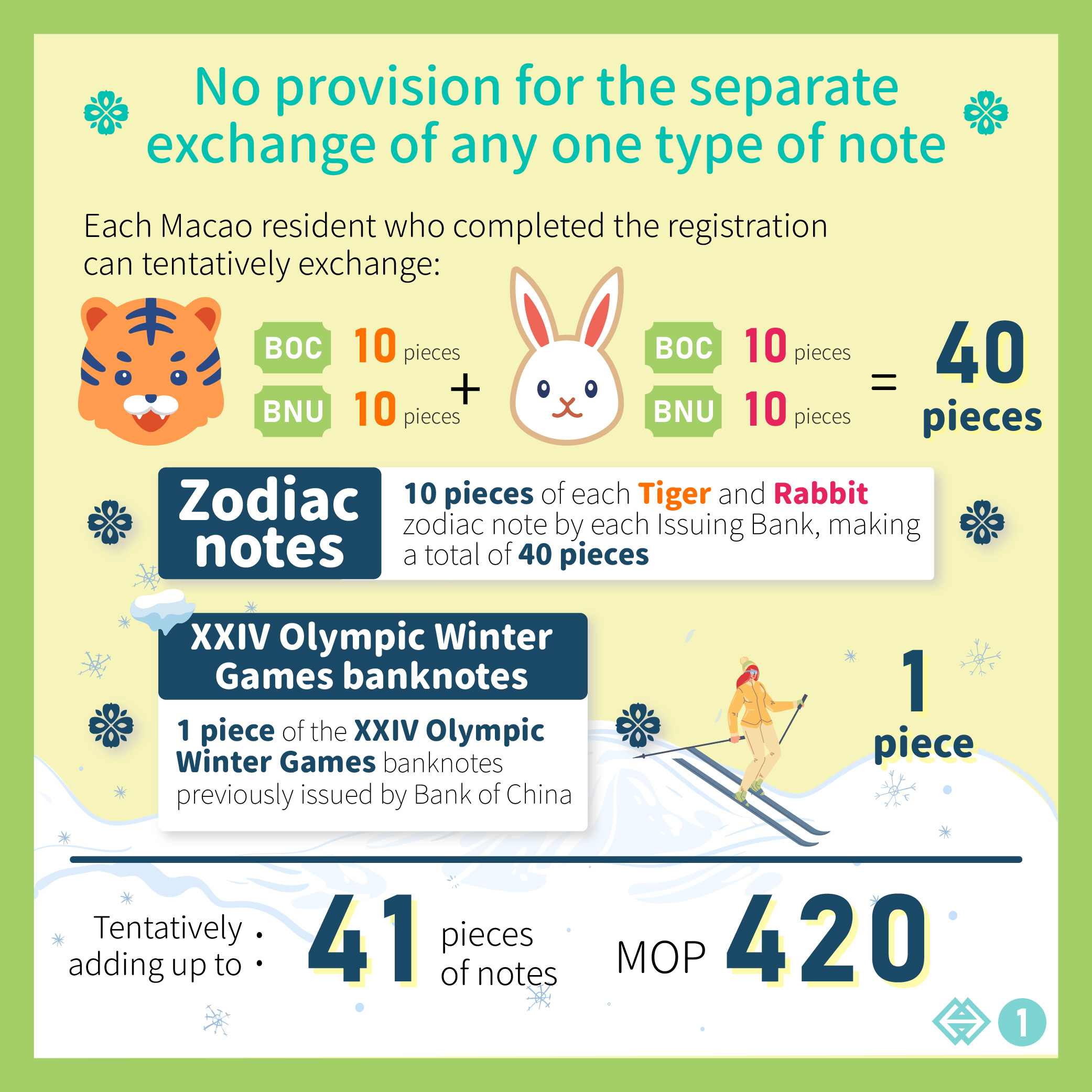 The tentative exchange quantity for the Tiger and Rabbit Zodiac banknotes of each Issuing Bank is 10 pieces, making a total of 40 pieces of the two types of Zodiac Banknotes from the two Issuing Banks. On the other hand, the tentative exchange quantity for the XXIV Olympic Winter Games banknotes previously issued by Bank of China is 1 piece. Each Macao resident can only conduct a single registration for the exchange of a total of 40 pieces of the two types of Zodiac banknotes and 1 piece of the XXIV Olympic Winter Games banknotes, adding up to 41 pieces, with no provision for the separate exchange of any one type of note. Depending on the final number of registrants, the actual quantity to be exchanged may be adjusted and will be announced after the end of the registration period.