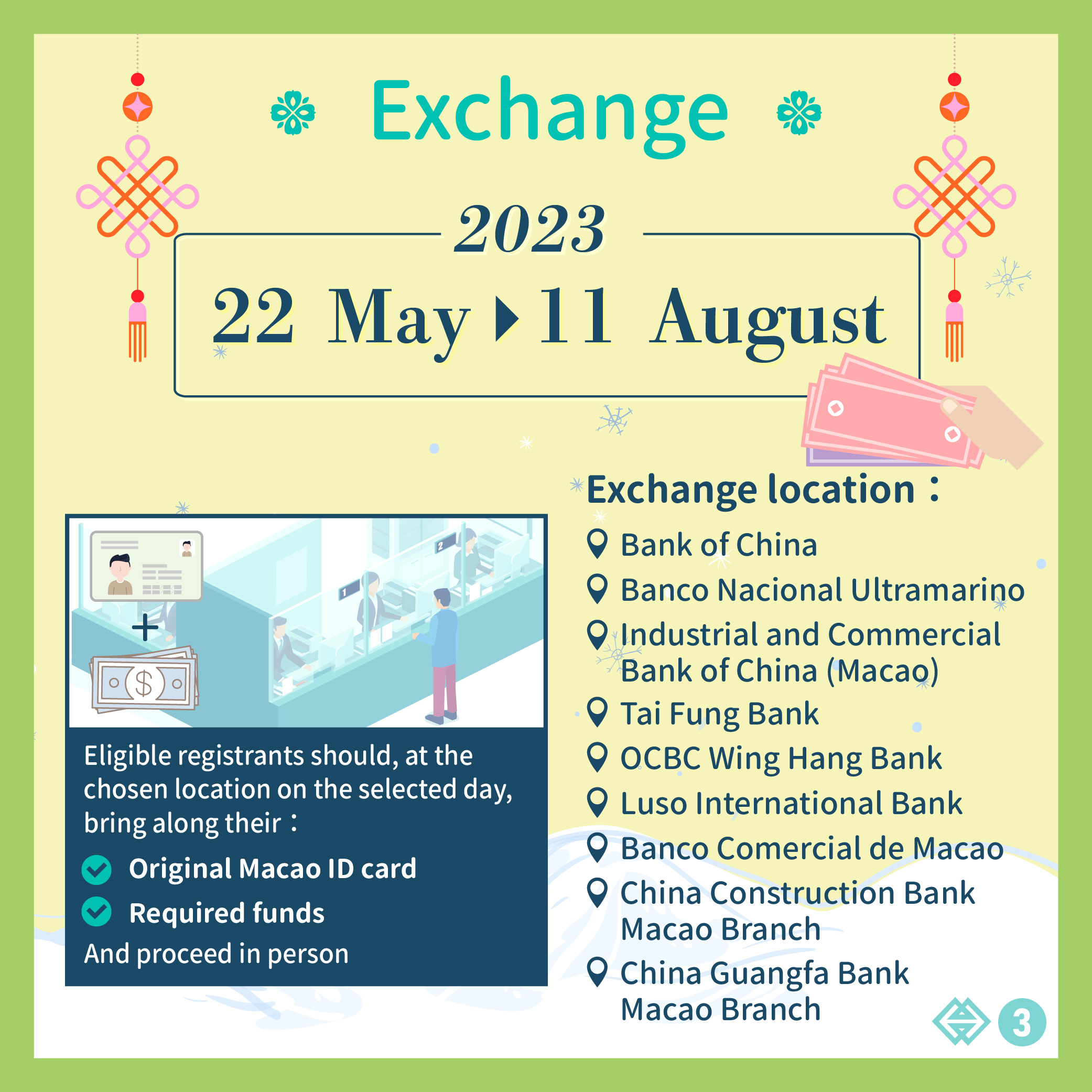 The exchange period is between 22 May 2023 and 11 August 2023, and the exchange locations include the selected branches of Bank of China (BOC), Banco Nacional Ultramarino (BNU), Industrial and Commercial Bank of China (Macao) Limited, Tai Fung Bank Limited, OCBC Wing Hang Bank Limited, Luso International Banking Limited, Banco Comercial de Macao, China Construction Bank Macao Branch and China Guangfa Bank Macao Branch. Registrants should bring along their original Macao ID card and required funds and proceed in person to exchange for the notes at the chosen location on the selected day. In respect of the note exchange conducted by authorized representative, the latter will need to bring along his/her original identity document and submit the following signed documents: