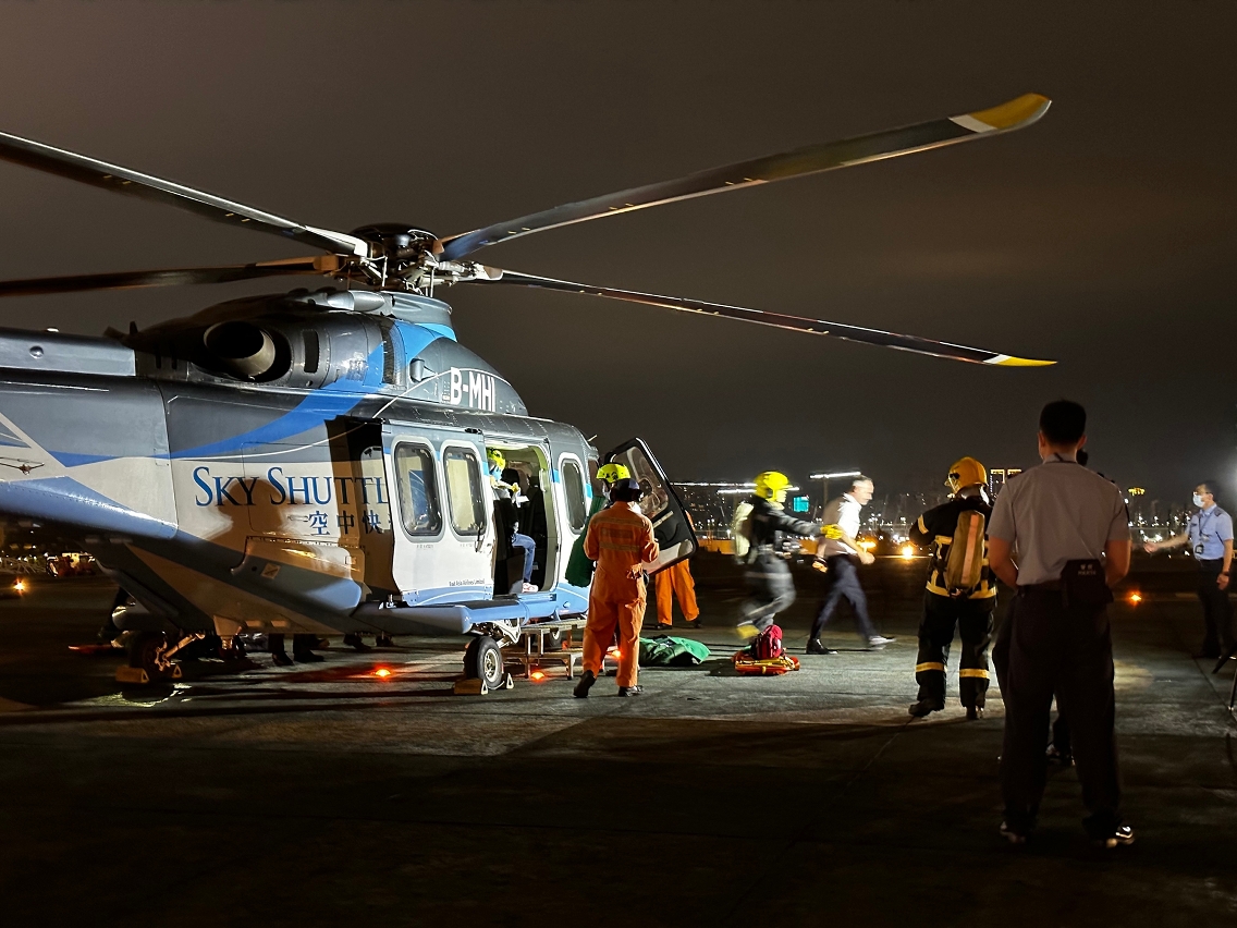 The heliport carried out the full scale emergency exercise yesterday night (10 May) to test the capacity of the personnel in handling emergencies and train them with the necessary skills. The exercise simulated the scenario of a tail rotor drive failure after the helicopter has taken off, the accident of which resulted in a forced heavy landing on the mainpad. All responsible parties activated their contingency plans to resolve the crisis.