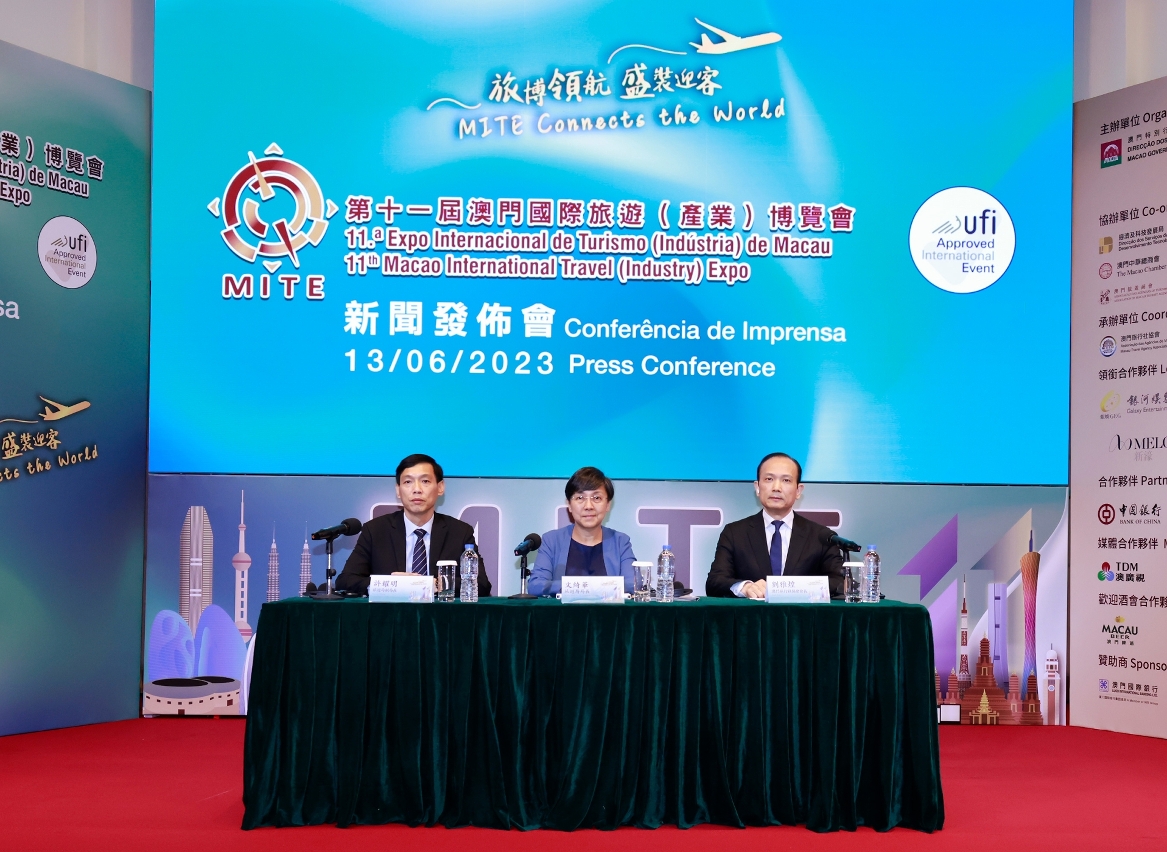 Committed to the Macao SAR Government’s development strategy of “1+4” adequate diversification, the Expo aims to deepen integration across “tourism +” and enrich the city’s dynamic as a world centre of tourism and leisure. MGTO and Macau Travel Agency Association co-held a press conference today (13 June) to elaborate the program of the 11th MITE. MGTO Director Maria Helena de Senna Fernandes, MGTO Deputy Director Ricky Hoi, and President of Macau Travel Agency Association, Alex Lao, attended the press conference with other personages.