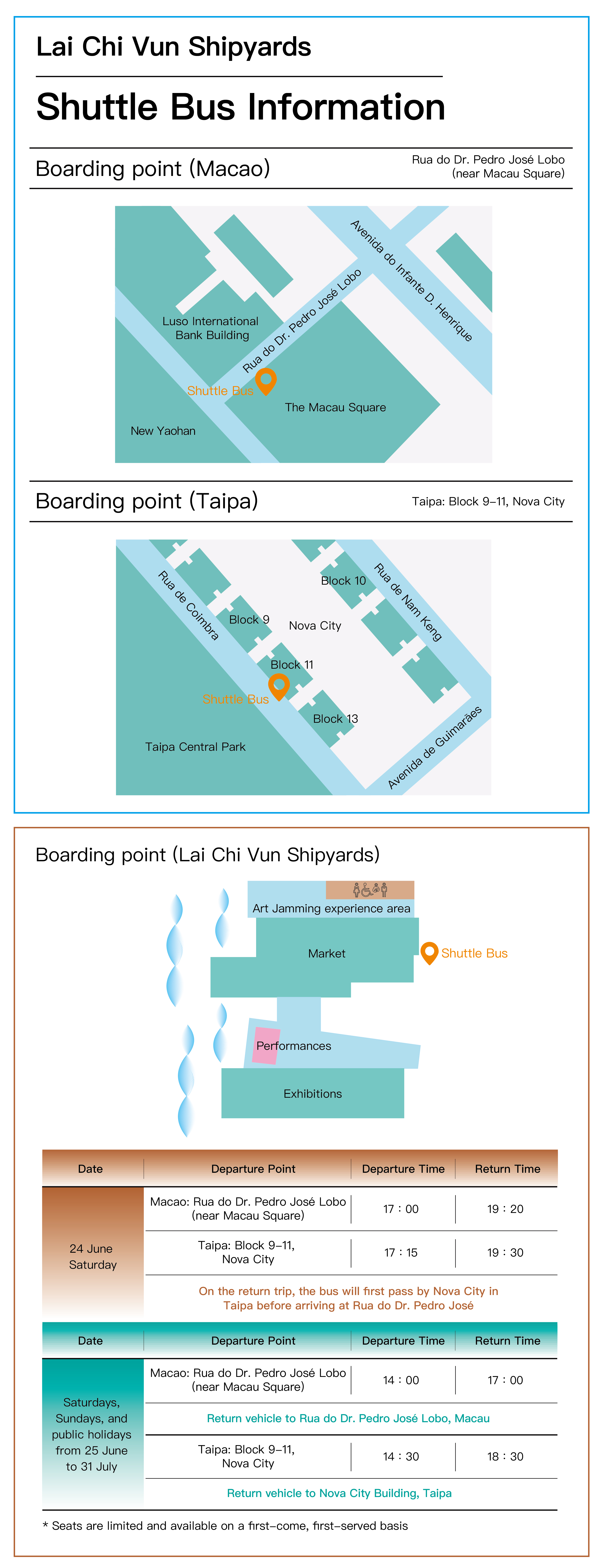 In order to facilitate the residents and tourists to participate in the opening ceremony of the Lai Chi Vun Shipyards, free shuttle buses will be provided on 24 June (Saturday) from Rua do Dr. Pedro José Lobo (departs at 5pm) and from Nova City Building in Taipa, Blocks 9-11 (departs at 5:15pm). The meeting point for the return shuttle buses is located in front of the featured market in the shipyards and the buses will depart at 7:20pm and 7:30pm, respectively. From 25 June to 31 July, shuttle buses will be provided on Saturdays, Sundays and on public holidays at the aforementioned locations. Seats are limited and available on a first-come, first-served basis. (Shuttle buses depart from Rua do Dr. Pedro José Lobo at 2pm and return at 5pm; while shuttle buses depart from Nova City at 2:30pm and return at 6:30pm).