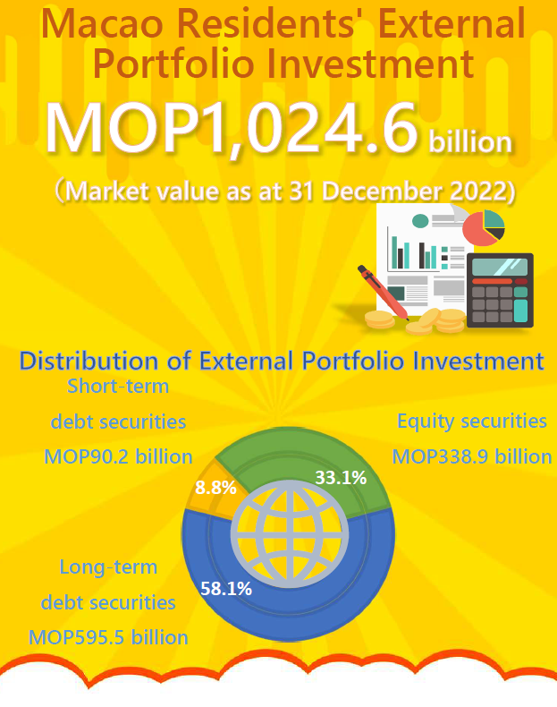According to the statistics released today by the Monetary Authority of Macao, on 31 December 2022, investment of Macao residents (including individuals, the government and other legal entities but excluding Macao’s foreign exchange reserves) in securities issued by unrelated non-residents reached MOP1,024.6 billion at current market value, representing a rise of 1.8% from end-June 2022 or a fall of 6.7% from end-2021. Among the various instruments of portfolio investment, equity securities (including mutual funds and investment trust units), long-term debt securities and short-term debt securities were valued at MOP338.9 billion, MOP595.5 billion and MOP90.2 billion respectively. As compared with a year ago, the market values of equity securities and long-term debt securities decreased by 12.9% and 8.0% respectively whereas short-term debt securities increased by 46.6%.