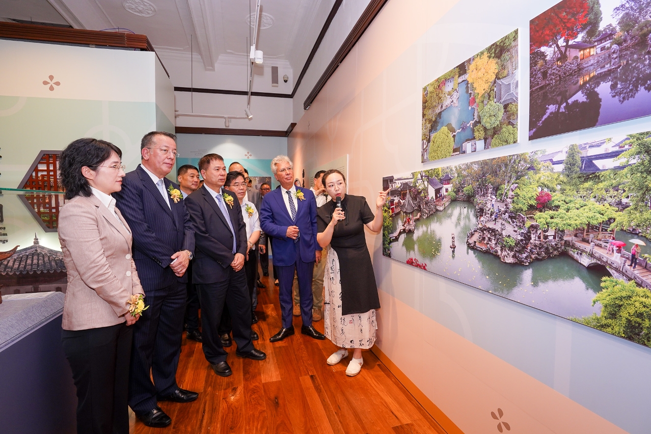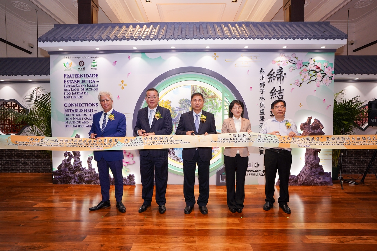 “Connections Established – Exhibition on Lion Forest Garden in Suzhou and Lou Lim Ioc Park in Macao” is held with the support of the Liaison Office of the Central People's Government in the Macao SAR and the Hong Kong and Macao Affairs Office of Suzhou Municipal People’s Office to advance the exchange between Suzhou and Macao and jointly promote excellent Chinese traditional culture. The opening ceremony of the exhibition was held today (7 July) in Chon Chou Tong Pavilion in Lou Lim Ioc Park. Huang Huagai, Deputy Secretary-General and Director of the Department of Social Affairs of the Liaison Office of the Central People's Government in the Macao SAR, José Tavares, Chairman of the Administration Committee on Municipal Affairs of IAM, Han Libo, Deputy Director of the Gardening and Greening Bureau of Suzhou and other guests attended the ceremony. The scenery of Lion Forest Garden in Suzhou is showcased in videos, pictures and texts. Miniature models, calligraphy and paintings are also displayed so that the public can experience the elegance of the Classical Gardens of Suzhou.