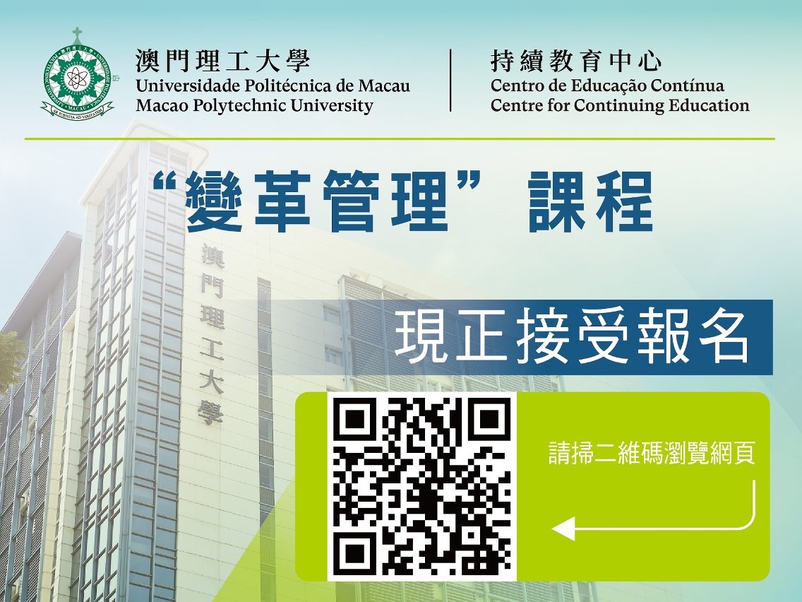 The global social and economic situation is changing instantaneously, forcing the industries to accelerate transformation and upgrading to cope with competition. Therefore, practitioners must also take timely actions to tackle with challenges. In order to maintain core competitiveness, organisations must successfully adapt to changes, control changes, and even actively influence changes in the face of industrial adjustments, market fluctuations, and changes in the competitive situation, and seize opportunities in crises. In order to do so, organisation management needs to understand and master the concept and ability of change management. The Centre for Continuing Education of Macao Polytechnic University is about to launch a “Change Management” course, which is now open for application.