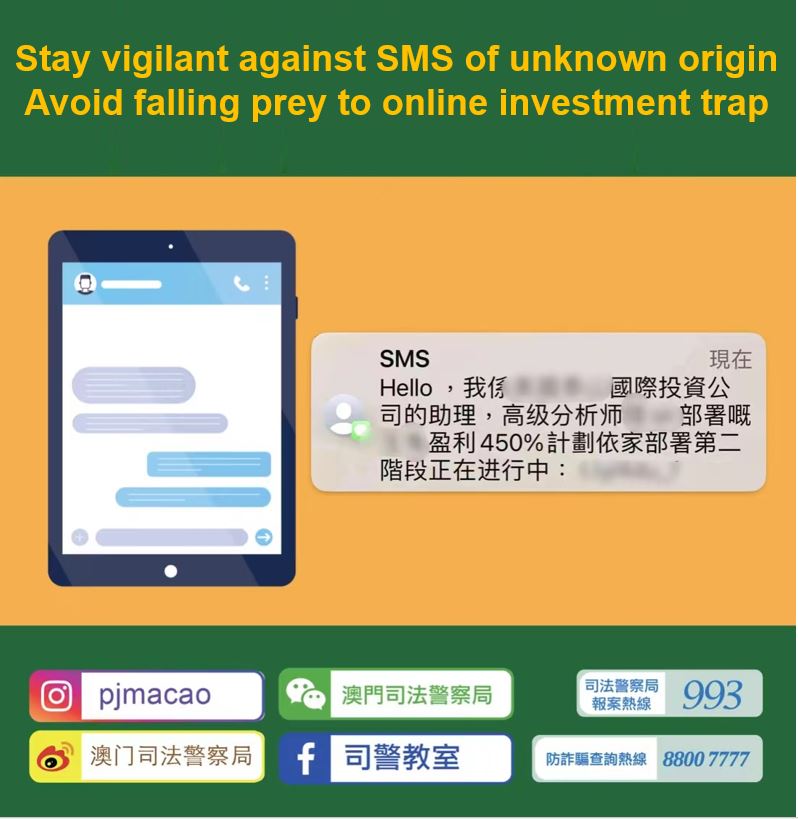 The Judiciary Police (PJ) has recently uncovered a scam where swindlers randomly send promotional SMS messages to residents, alleging they are senior analysts from some investment firms. They claim they have an investment plan with returns several times the initial amount and attach a link in the SMS for victims to contact them.