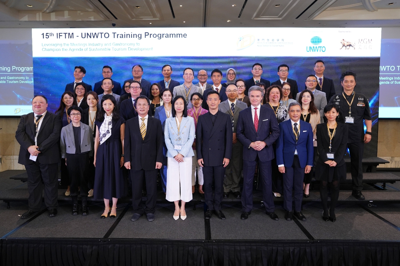 The Global Centre of Tourism Education and Training of the Macao Institute for Tourism Studies (IFTM), in collaboration with United Nations World Tourism Organisation (UNWTO), successfully kicked off her 15th training programme “Leveraging the Meetings Industry and Gastronomy to Champion the Agenda of Sustainable Tourism Development” on 18 September 2023 at MGM COTAI. This is the 1st face-to-face training after the pandemic.
