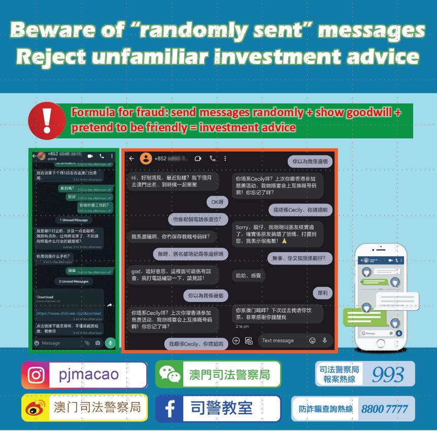 The Judiciary Police (PJ) has recently discovered that swindlers randomly send SMS or WhatsApp messages to members of the public. They initiate the conversation with a familiar tone, then say they have got the wrong number and added the user by mistake. Should the victim respond to the messages, they will start chatting with the victim and win the victim’s trust. Next, they will encourage the victim to download a fake investment app, claiming they can earn lucrative profits through investing in the A-share market or cryptocurrencies. They will also pull the victim into WhatsApp groups to obtain "investment tips" and persuade them to join a bogus investment plan.