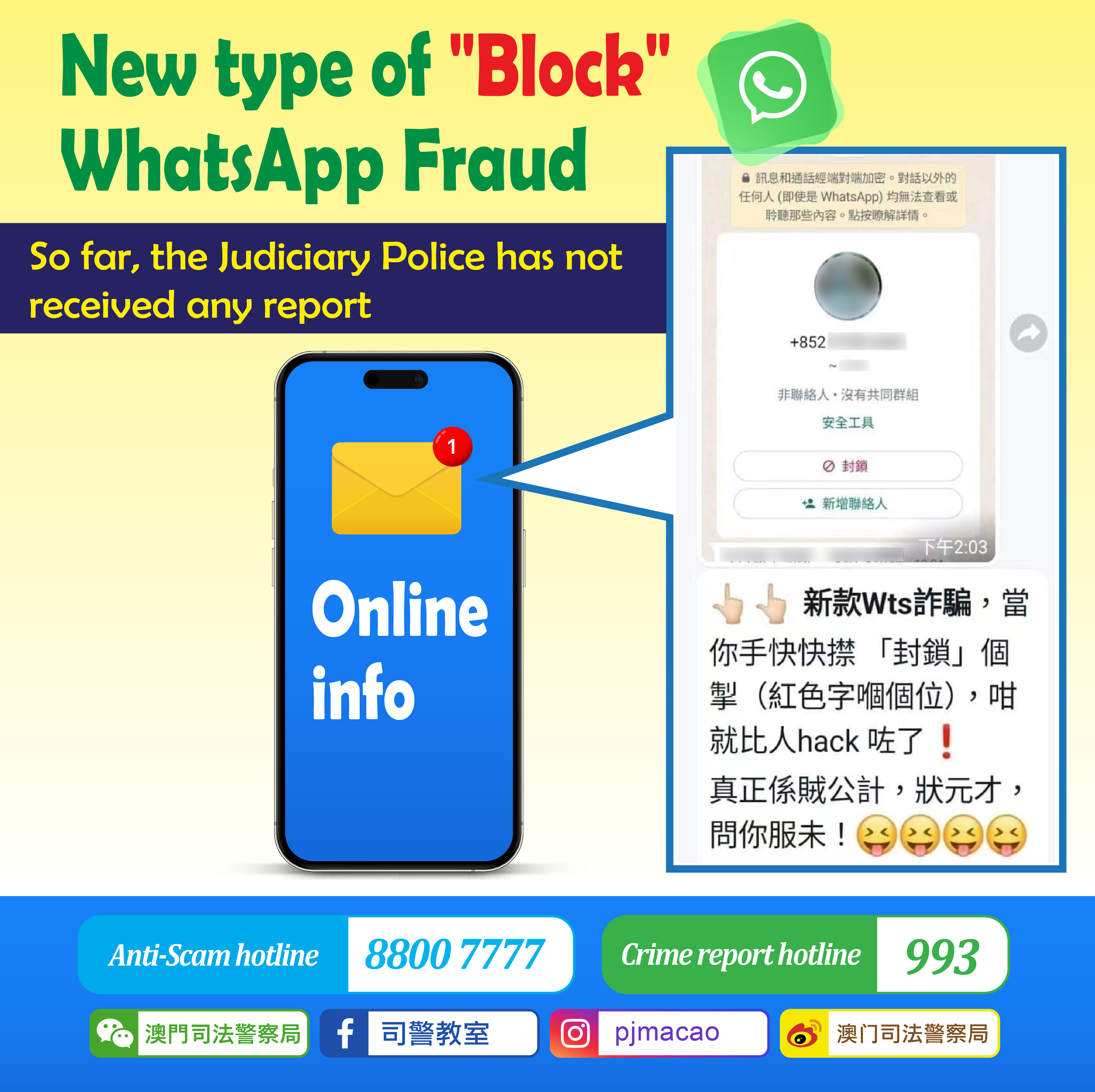 The Judiciary Police’s Anti-Fraud Coordination Center reminds the public that it has not received any report of the fraud mentioned above. The center advises the public to be careful and verify information from the Internet to avoid falling into fraudsters’ traps. If they suspect they have been defrauded, please call the Judiciary Police's Anti-Fraud Enquiry hotline at 8800 7777.