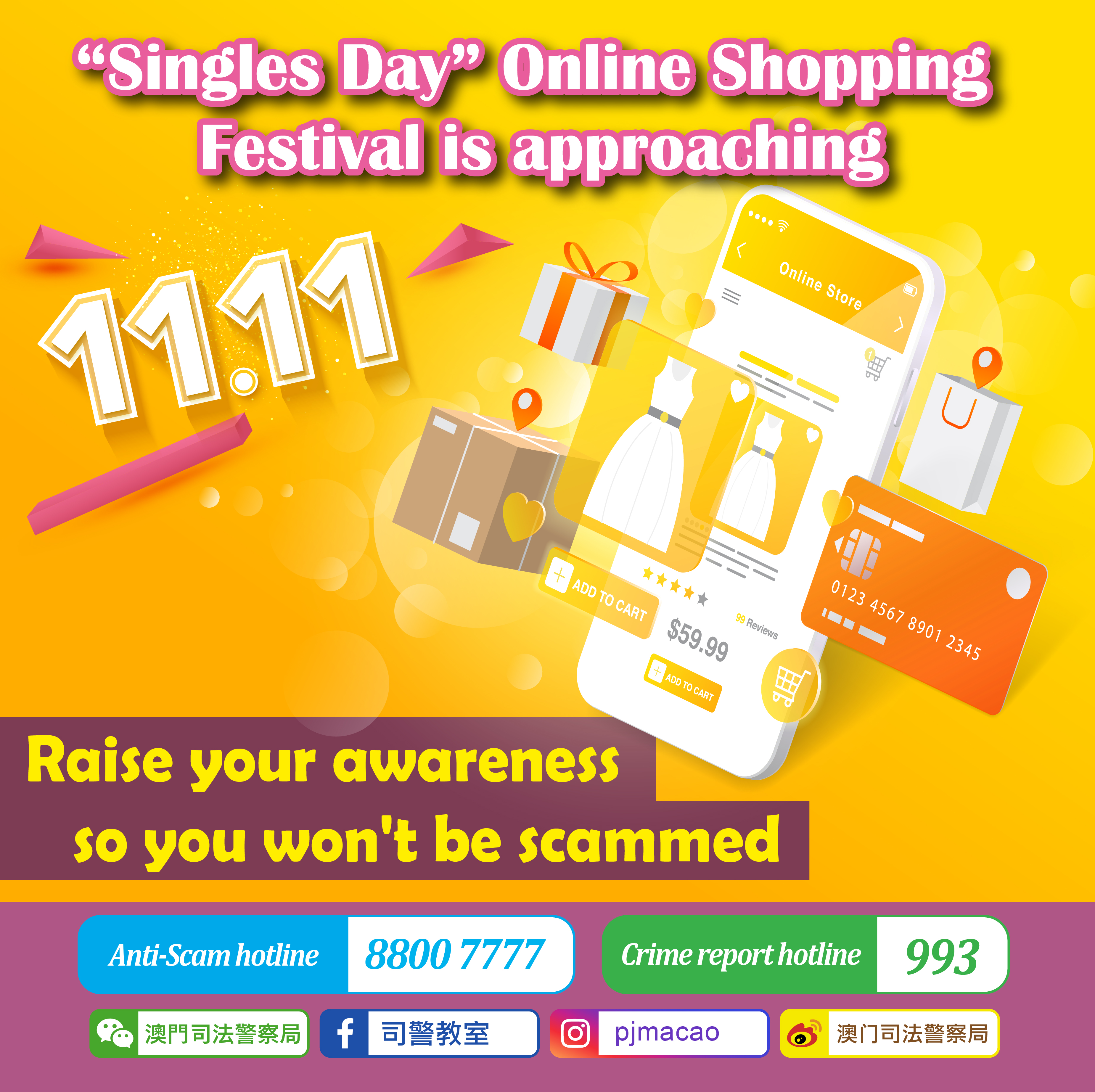 4) If you suspect you have been cheated, immediately call the Judiciary Police's Anti-Fraud Enquiry hotline at 8800 7777 or the crime report hotline at 993 for assistance.