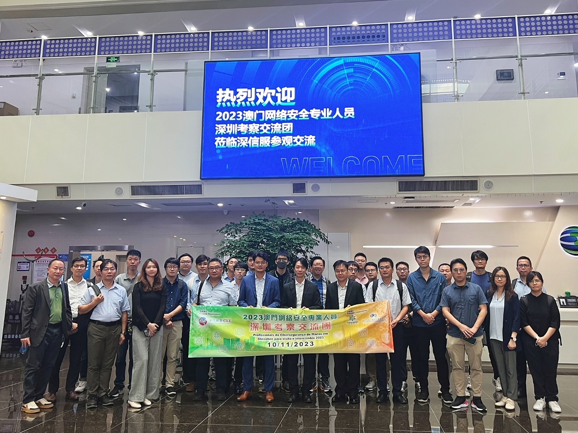The "2023 Macao Cybersecurity Professionals Shenzhen Inspection and Exchange Delegation" organized by the Macao Post and Telecommunications Bureau (CTT) and co-organized by the Science and Technology Development Fund and the Macau Productivity and Technology Transfer Center, was successfully held on 10th November this year. The activity invited cybersecurity professionals total of 30 people from private operators of critical infrastructure in the fields of television and audio broadcasting, telecommunications networks, qualified private legal entities of public administrative utility in the scientific and technological area, and commercial companies with exclusively public capital, visited cybersecurity-related institutions in Shenzhen and Dongguan for inspection and exchange.