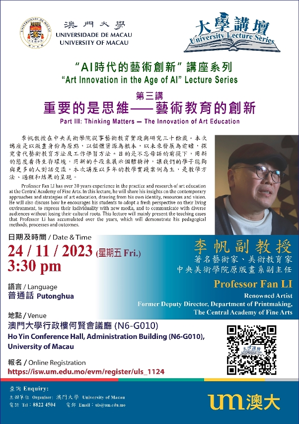 The third lecture, titled ‘Thinking Matters—The Innovation of Art Education’, will be held at 3:30pm on 24 November at Ho Yin Conference Hall (N6-G010), with Prof Li Fan as the speaker. As a renowned artist and art educator, Prof Li is deputy director of the Department of Printmaking at CAFA. He will discuss the innovative aspects of art education, focusing on its purpose, content and methods. He will also share his philosophy and practical experiences in art education. Prof Wang Qingjie, University of Macau Development Foundation Distinguished Professor of Philosophy and Religions Studies and associate dean of the Faculty of Arts and Humanities at UM, will be the moderator. Interested individuals can register at: https://isw.um.edu.mo/evm/register/uls_1124.