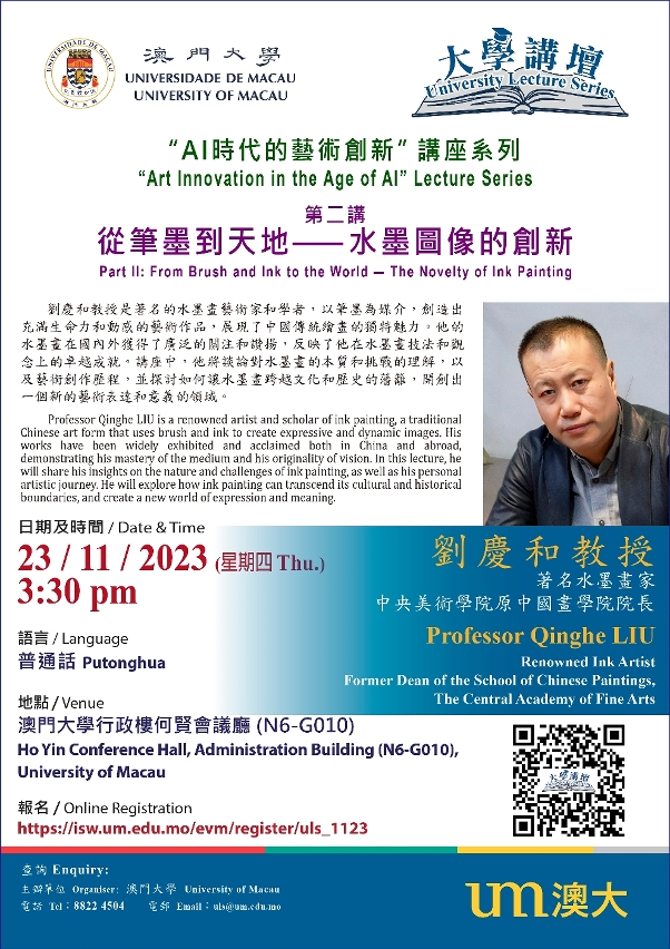 The second lecture, titled ‘From Brush and Ink to the World—The Novelty of Ink Painting’, will be held at 3:30pm on 23 November at Ho Yin Conference Hall (N6-G010), with Prof Liu Qinghe as the speaker. As a renowned ink artist, Prof Liu is former dean of the School of Chinese Paintings at CAFA. He will analyse the innovative potential of ink painting by examining the nature, characteristics and development history of ink. In addition, he will share his exploratory journey and practice in ink art. Prof Yao Jingming, full professor in the Department of Portuguese at UM, will be the moderator. Interested individuals can register at: https://isw.um.edu.mo/evm/register/uls_1123.