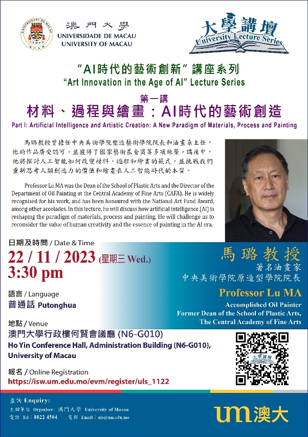 The first lecture, titled ‘Artificial Intelligence and Artistic Creation: A New Paradigm of Materials, Process and Painting’ will be held at 3:30pm on 22 November at Ho Yin Conference Hall (N6-G010), with Prof Ma Lu as the speaker. As an accomplished oil painter, Prof Ma is former dean of the School of Plastic Arts at CAFA. He will explore the new paradigm of art creation in the age of AI from the aspects of materials, process and painting. Moreover, he will share his experiences and insights in oil painting creation. Prof Li Jun, chair professor and head of the Department of Art and Design at UM, will be the moderator.