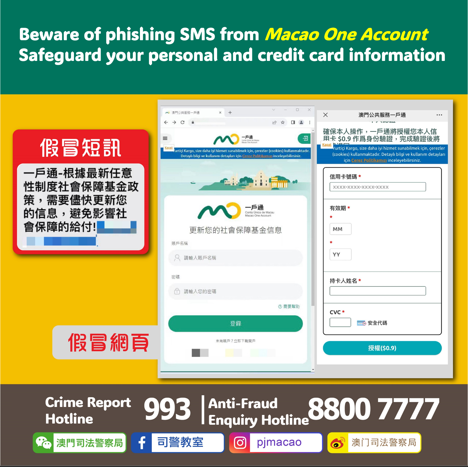 Upon clicking the link, individuals were redirected to a phishing website which interfaces bore a close resemblance to that of the "Macao One Account." The fake site prompted victims to enter their account name and login password. Subsequently, the fraudulent site required victims to provide credit card details (including card number, expiration date, cardholder's name, and security code) for identity verification.