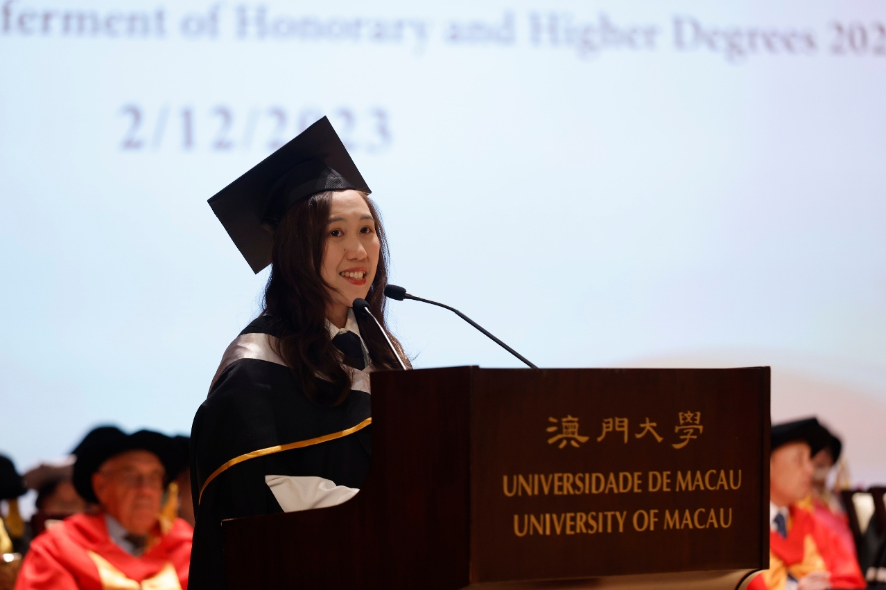 In her speech, Secretary Ao Ieong said that UM has actively implemented the higher education policies of the Macao SAR Government. The university has continuously improved the quality of its faculty, teaching, and research, and achieved significant results in expanding regional and international cooperation, fostering research innovation, and promoting industry-academia collaboration. As a result, UM’s international reputation has been growing steadily. It is worth noting that UM has made an impressive debut in the Times Higher Education World University Rankings 2024, securing the 193rd position and placing it among the top 200 universities worldwide. The Macao SAR Government will support local public institutions, including UM, to explore favourable development opportunities in the Guangdong-Macao In-depth Cooperation Zone in Hengqin, and further support higher education to replenish the talent pool for the development of key industries in Macao. She also encouraged the graduates to demonstrate their love and commitment to the country and Macao, and put into practice UM’s motto ‘humanity, integrity, propriety, wisdom, and sincerity’, so as to contribute their wisdom and strength to the robustness of the ‘One Country, Two Systems’ policy, the great rejuvenation of the Chinese nation, and the advancement of human civilisation.