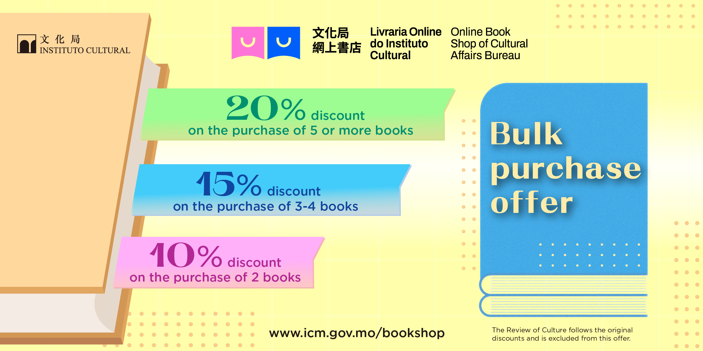 Since its launch by the Cultural Affairs Bureau (IC, from the Portuguese acronym), the Online Book Shop has been well received by local and overseas readers. In order to promote a reading atmosphere and in appreciation of readers’ support, the Online Book Shop will launch new “bulk purchase offer” from 5 January 2024, providing different discounts based on the quantity of books purchased. Readers may enjoy a 10% discount when purchasing two books, a 15% discount when purchasing three or four books, and a 20% discount when purchasing five or more books.
