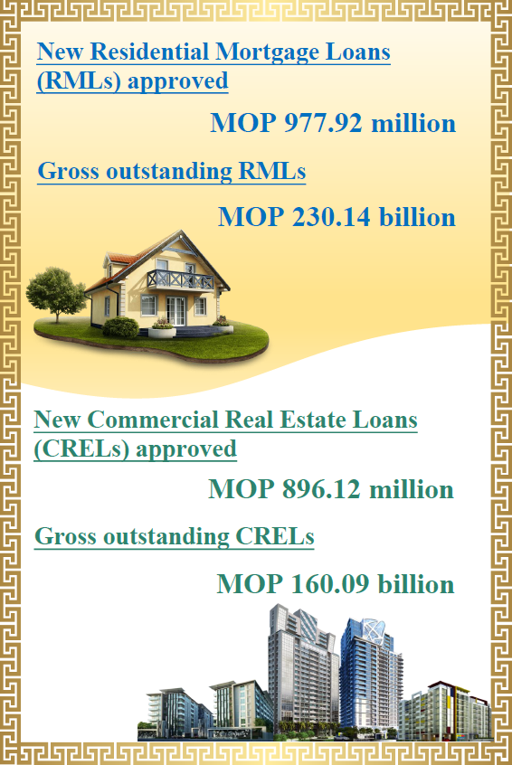 Residential mortgage loans refer to credit facilities provided by banks to individuals and enterprises that are collateralised by residential real estate in Macao. They include loans to finance purchase of residential properties and other purposes (such as refinancing loans, working capital and trade financing). Commercial real estate loans refer to credit facilities provided by banks to individuals and enterprises that are collateralised by commercial real estate in Macao. They include loans to construction companies and loans to finance property development and investment.