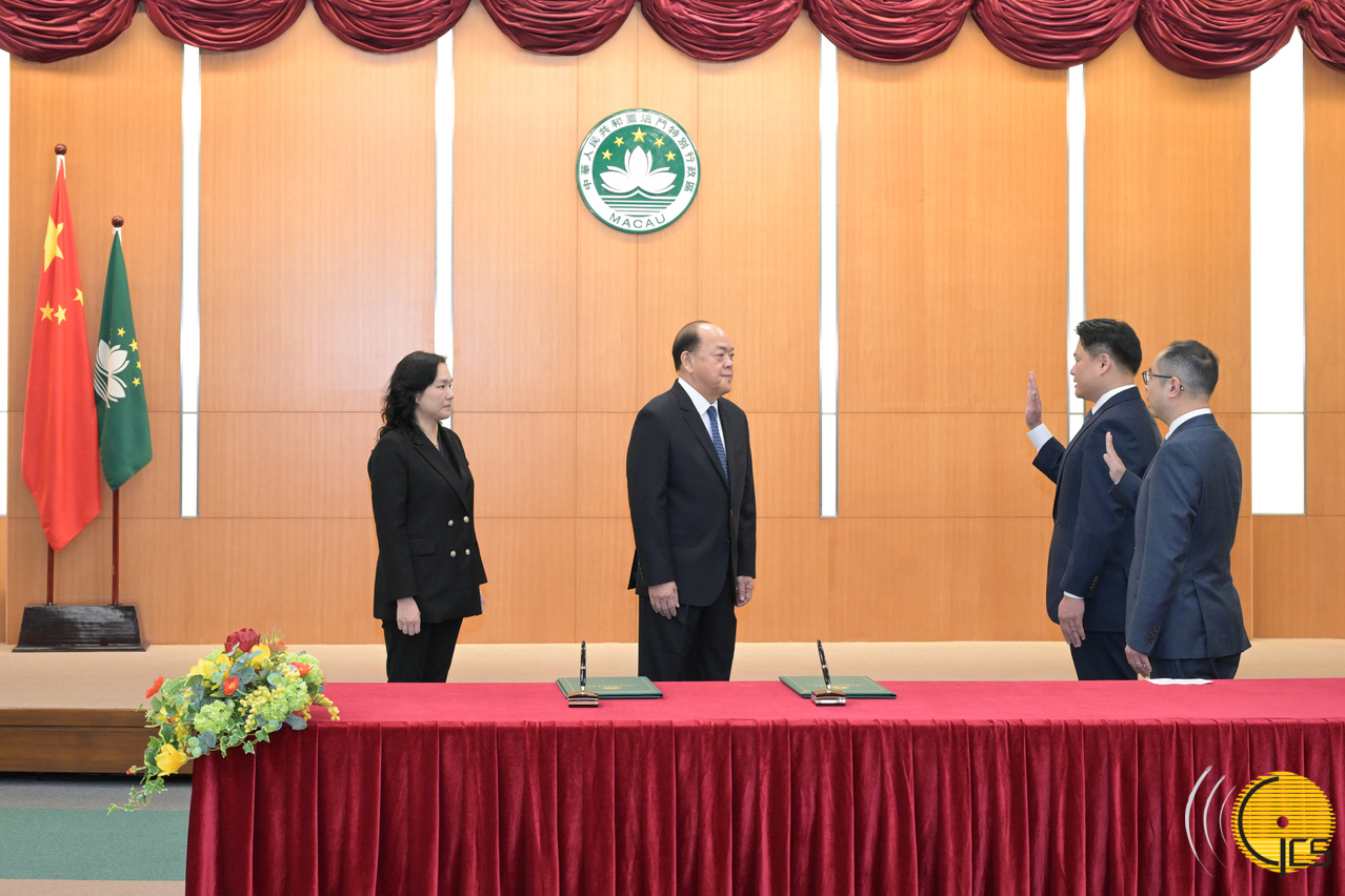 Administered by the Chief Executive Mr. Ho Iat Seng and witnessed by the Chief of Office of the Chief Executive’s Office Ms. Hoi Lai Fong, Mr. Loi Chi San and Mr. Pun Keng Sang were sworn in as Director and Deputy Director of the Government Headquarters Affairs Bureau (DSASG) respectively today (1st February) in the Multi-function Room of Government Headquarters.