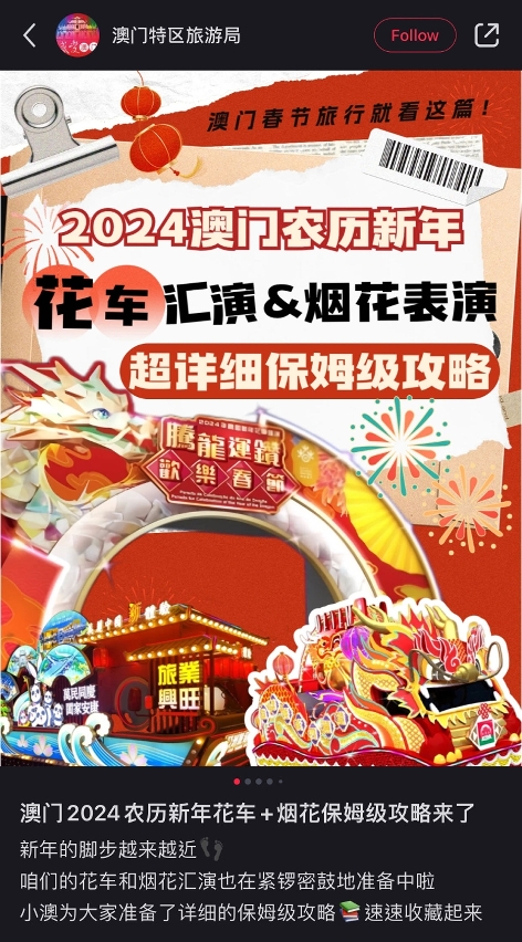 Please visit MGTO’s website for destination promotion: https://www.macaotourism.gov.mo or follow MGTO's WeChat ID “MGTOweixin” for more information about the community performances of the “2024 Chinese New Year Activities” and other Chinese New Year festivities organized by MGTO.