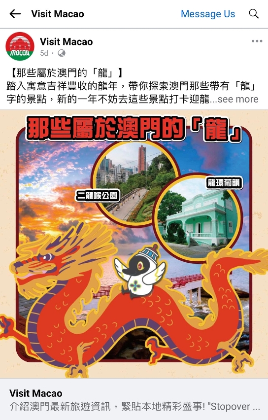 MGTO rolls out an array of online-offline initiatives to spotlight Macao as a fascinating destination teeming with Chinese New Year festivities, including promotional posts and live streams on social media. Travel KOLs are invited to promote the destination by posts and live streams on their channels, while advertisements are released on TV channels and so forth. The “Experience Macao” campaign also goes on to showcase the kaleidoscope of events in Macao each month.