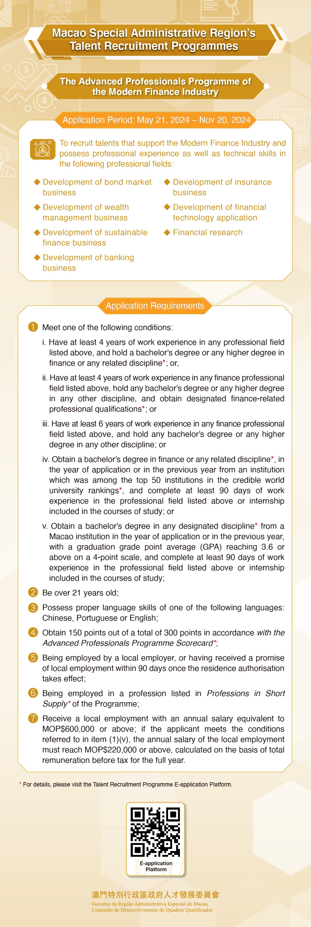 To facilitate the "1+4" strategy for the development of adequate economic diversification as well as further support local industries and sustainable social development, the Government of the Macao Special Administrative Region (SAR) launches its new round of talent recruitment programmes from May 21 to November 20, 2024. The 9 programmes include the High-end Talents Programme, the Outstanding Talents Programmes and the Advanced Professionals Programmes for the Big Health Industry, the High-Tech Industry, the Modern Finance Industry, as well as the Culture, Sports and Others Industries.
