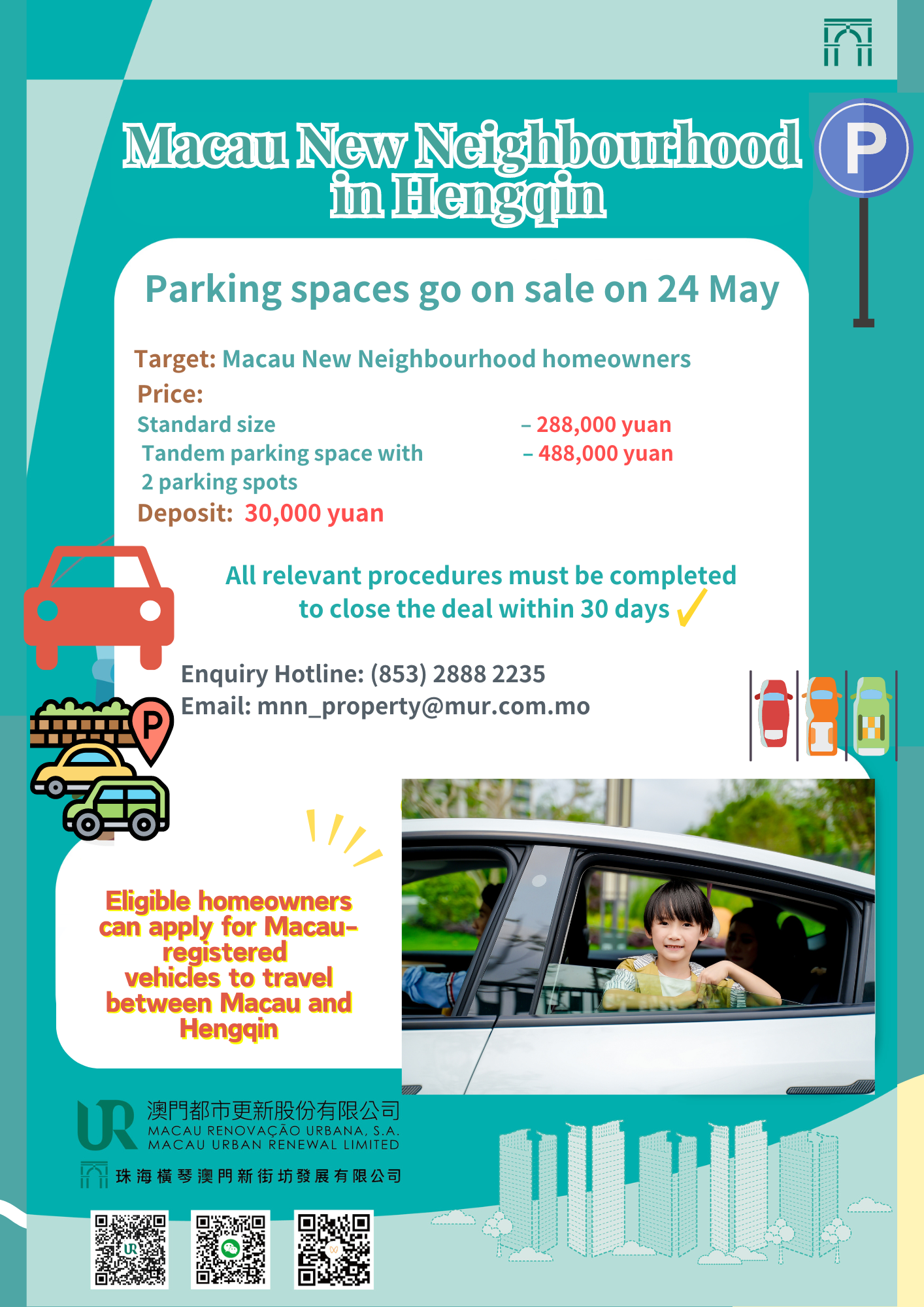 To learn more about the sale of parking spaces, please call (+853) 2888 2235 during office hours or email mmn_property@mur.com.mo.