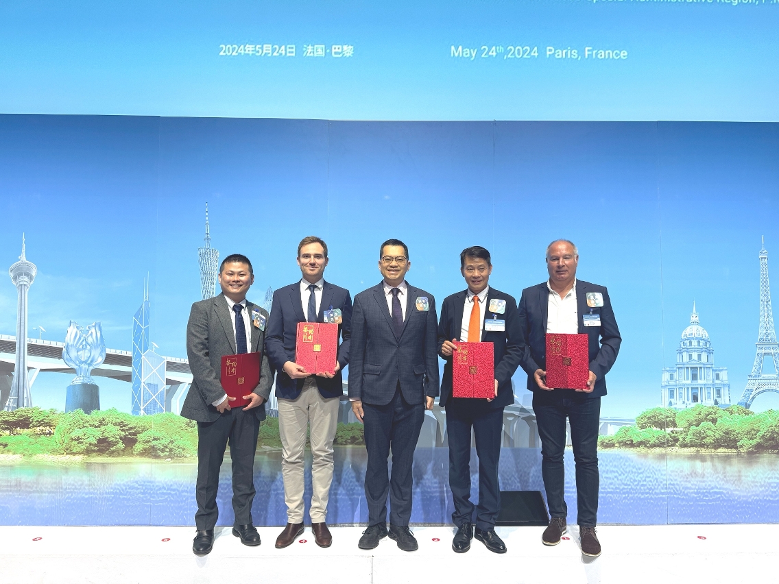 The Guangdong-Hong Kong-Macao Greater Bay Area and Europe (France) Economic and Trade Cooperation Conference, jointly hosted by the People's Government of Guangdong Province, the Hong Kong Special Administrative Region (SAR) Government, and the Macao SAR Government, was held in Paris, France on 24 May (Paris time). Governor of Guangdong Province Wang Weizhong, Financial Secretary of the Hong Kong SAR Government Paul Chan, and Secretary for Social Affairs and Culture Ao Ieong U, representing the Chief Executive of the Macao SAR, attended the event and delivered keynote speeches. The Macao Trade and Investment Promotion Institute (IPIM) organised Macao enterprises to attend the Conference along with the Macao SAR government delegation, taking this opportunity to present Macao-Hengqin business and investment environment to European investors and those from other countries and regions. The event attracted over 400 leaders of the political, commercial and industrial sectors from mainland China, France, other European countries and regions, as well as Hong Kong and Macao SARs, including the leaders from Fortune 500 companies.
