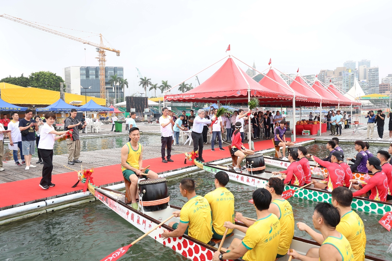 Attending the ceremony were Mr. Pun Weng Kun, President of the Sports Bureau; Ms. Angela Leong, Director of SJM Resorts, S.A.; Mr. Lai Pak Leng, Chairman of the Dragon Boat Association of Macao, China; Ms. Joana Maria Noronha, Deputy Director of the Public Administration and Civil Service Bureau; Ms. Isabel Celeste Jorge, Member of the Administration Committee on Municipal Affairs of the Municipal Affairs Bureau; Ms. Christine Lam and Mr. Luís Gomes, Vice Presidents of the Sports Bureau; Mr. Lam Chon Sang, Deputy Commissioner of the Fire Services Bureau; Mr. Vong Ka Hou, President of the Dragon Boat Association of Macao, China.