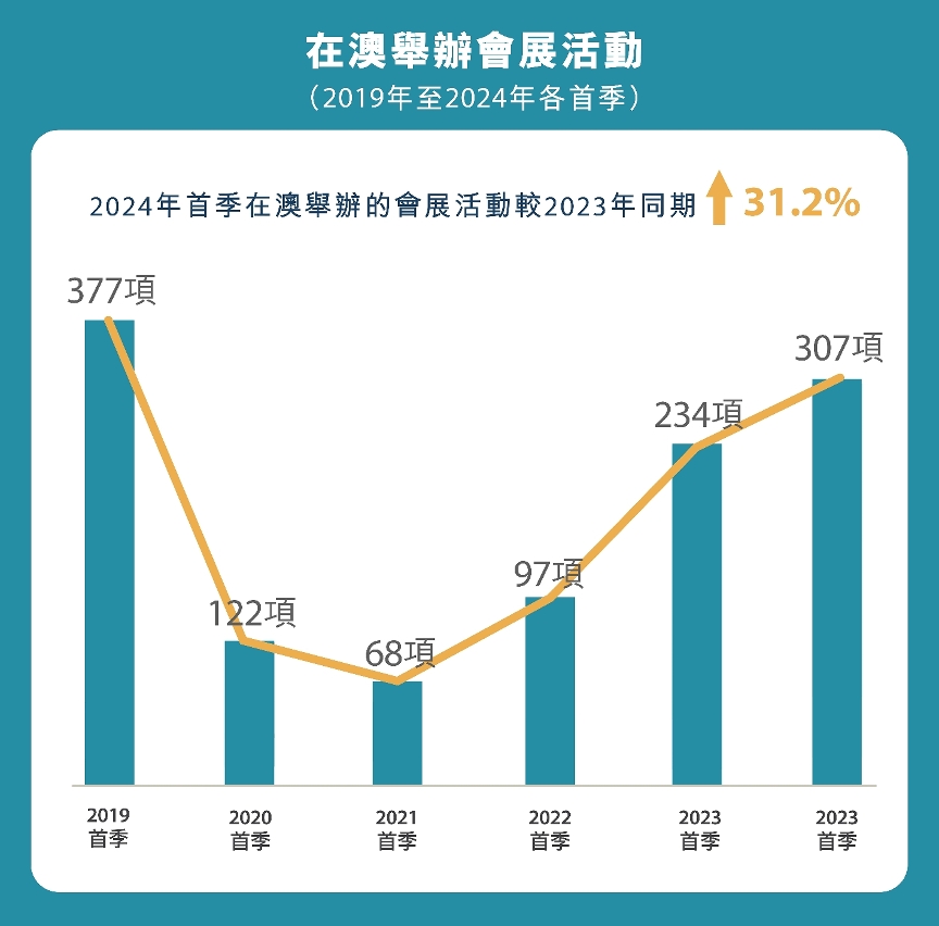 In the first quarter of 2024, 307 conventions and exhibitions were held in Macao, representing a year-on-year increase of 31.2%. And the proportions of the overseas exhibitors and professional visitors increased significantly by 32.2 percent and 39.5 percent respectively, compared with the same period last year. The conventions and exhibitions held in Macao led to about MOP 900 million non-gaming revenue, an increase of over 50% from the same period in 2023.