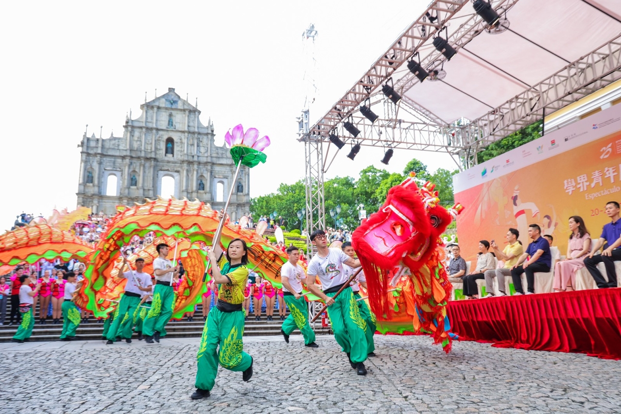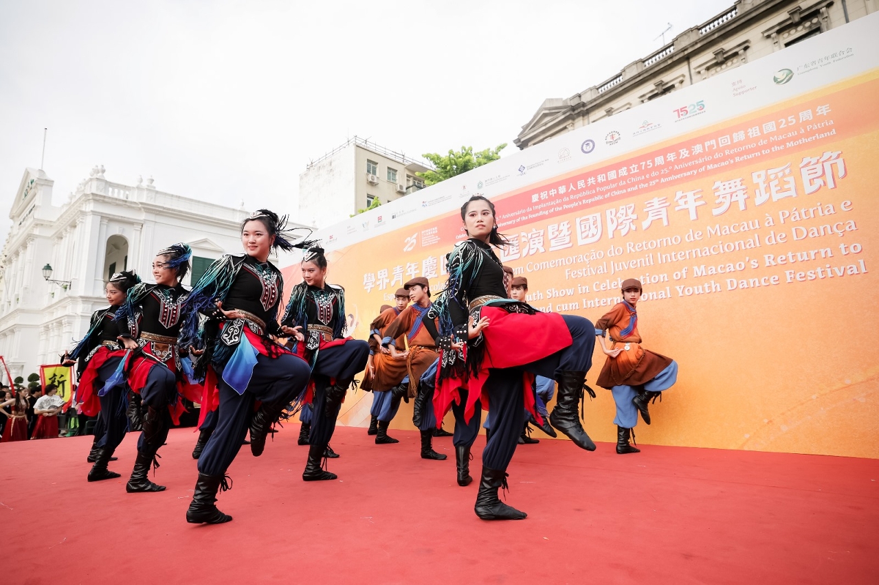 To celebrate the 75th anniversary of the founding of the People’s Republic of China and the 25th anniversary of Macao’s return to the motherland, the Education and Youth Development Bureau is holding the Student and Youth Show in Celebration of Macao’s Return to the Motherland cum International Youth Dance Festival from 20 to 25 July 2024. Successfully held this afternoon (20 July) at the Ruins of St Paul’s, the first activity—International Youth Dance Festival Parade—kicked off the event.
