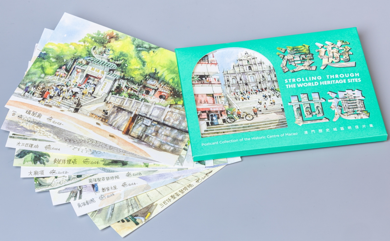 In order to promote the cultural connotations of the “Historic Centre of Macao” to residents and tourists, the Cultural Affairs Bureau (IC, from the Portuguese acronym) specially organised and launched the new cultural tourism product “Strolling through the World Heritage sites – Postcard Collection of the Historic Centre of Macao”, presenting the unique charm of the Historic Centre of Macao with beautiful watercolours, thereby enhancing Macao’s image as a member of the Organisation of World Heritage Cities and a city of tourism and leisure, and promoting the cultural essence of Macao to the world.