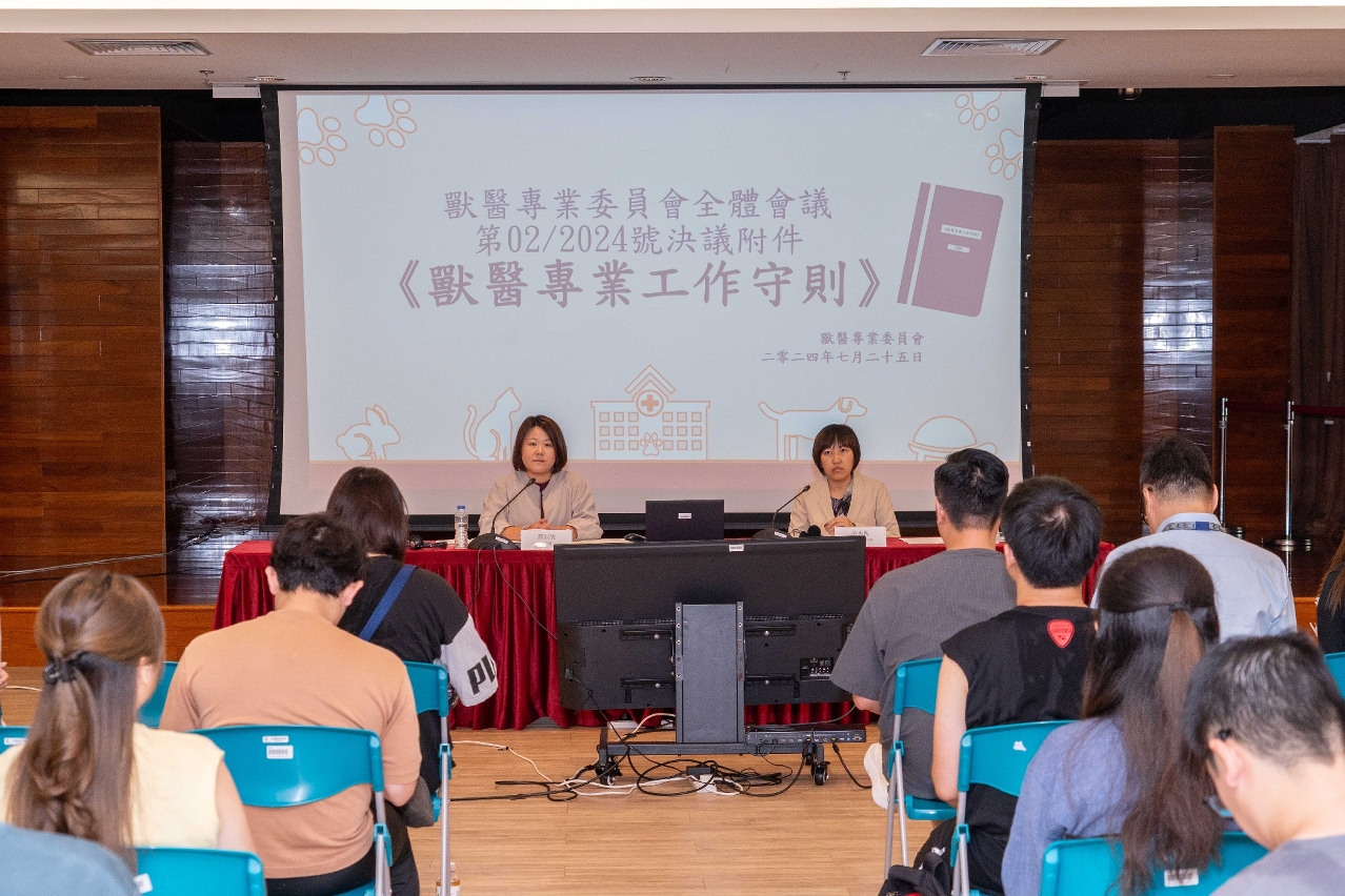 The Municipal Affairs Bureau (IAM) and the Council of Veterinary Medicine Professionals jointly held “Veterinary law popularisation seminar” to brief the veterinary clinical care sector on the “Code of Professional Ethics of Veterinary Surgeons” and their rights and obligations. A series of laws and regulations, including “Law on Veterinary Clinical Care and Commercial Activity of Animals”, “Animal Protection Law” and “Animal Epidemic Prevention Law”, was introduced during the seminar to encourage the sector to comply with the rules and apply them in their operations, so as to raise the veterinary profession’s service standard.