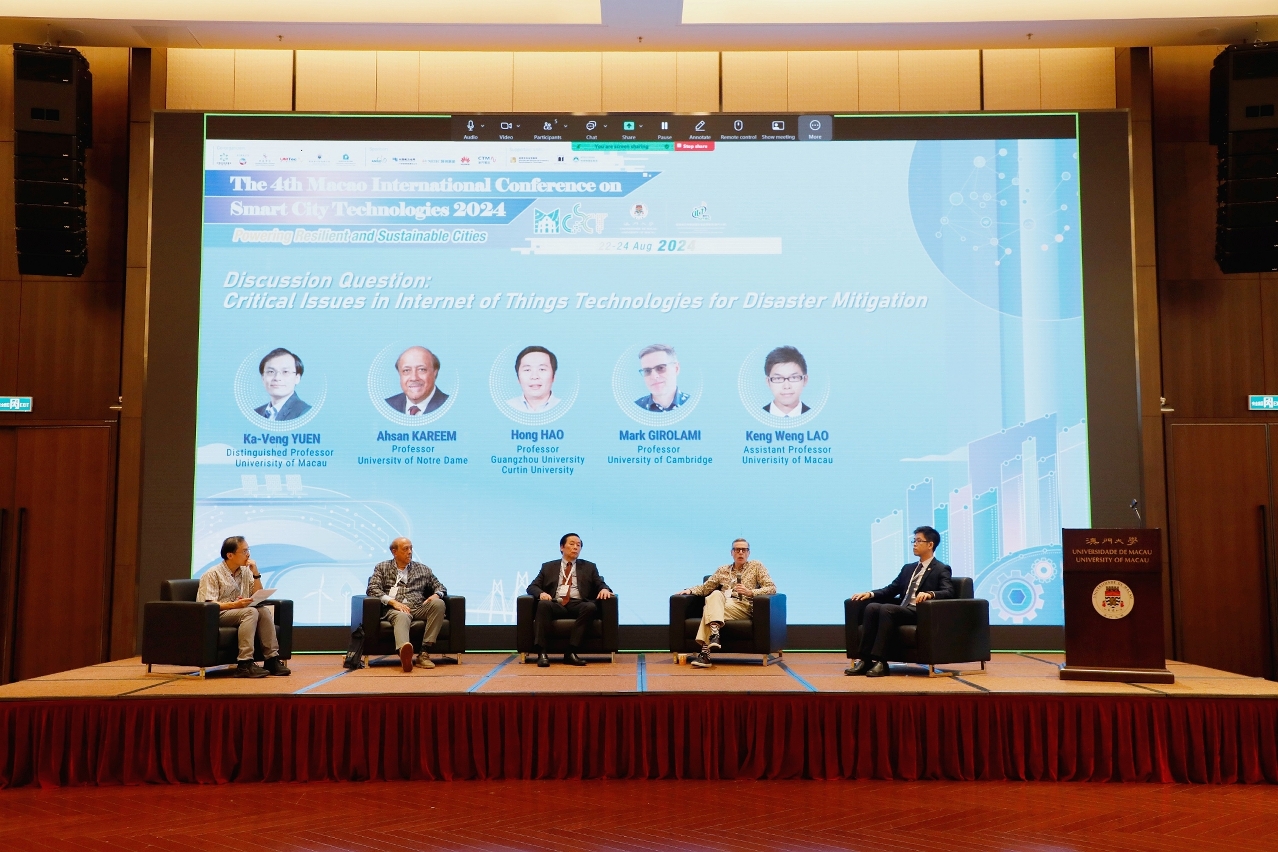 Keynote speakers at the conference included Mark Girolami, professor at the University of Cambridge; Ramteen Sioshansi, professor at Carnegie Mellon University; Ahsan Kareem, professor at the University of Notre Dame; Hao Hong, Distinguished Professor at Curtin University. In addition, the panel discussion titled ‘Critical Issues in Internet of Things Technologies for Disaster Mitigation’, moderated by Yuen Ka Veng, Distinguished Professor in the Faculty of Science and Technology at UM, attracted many scholars to engage in discussions.