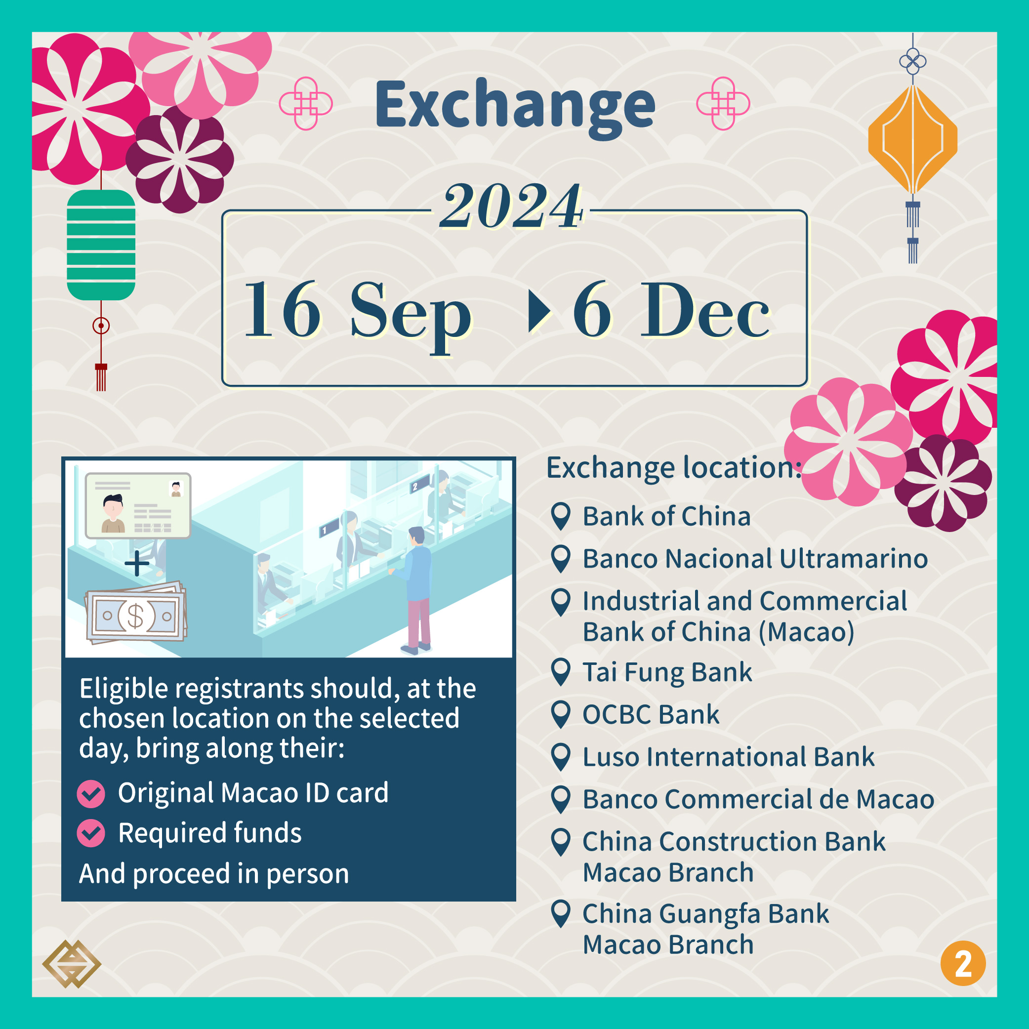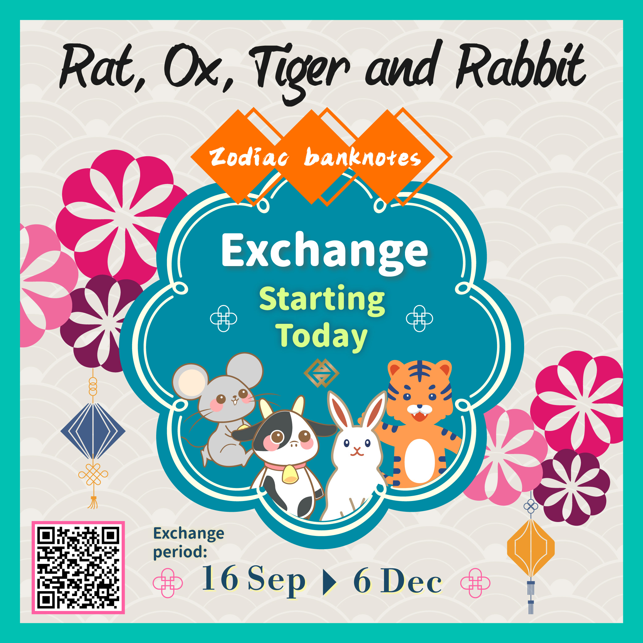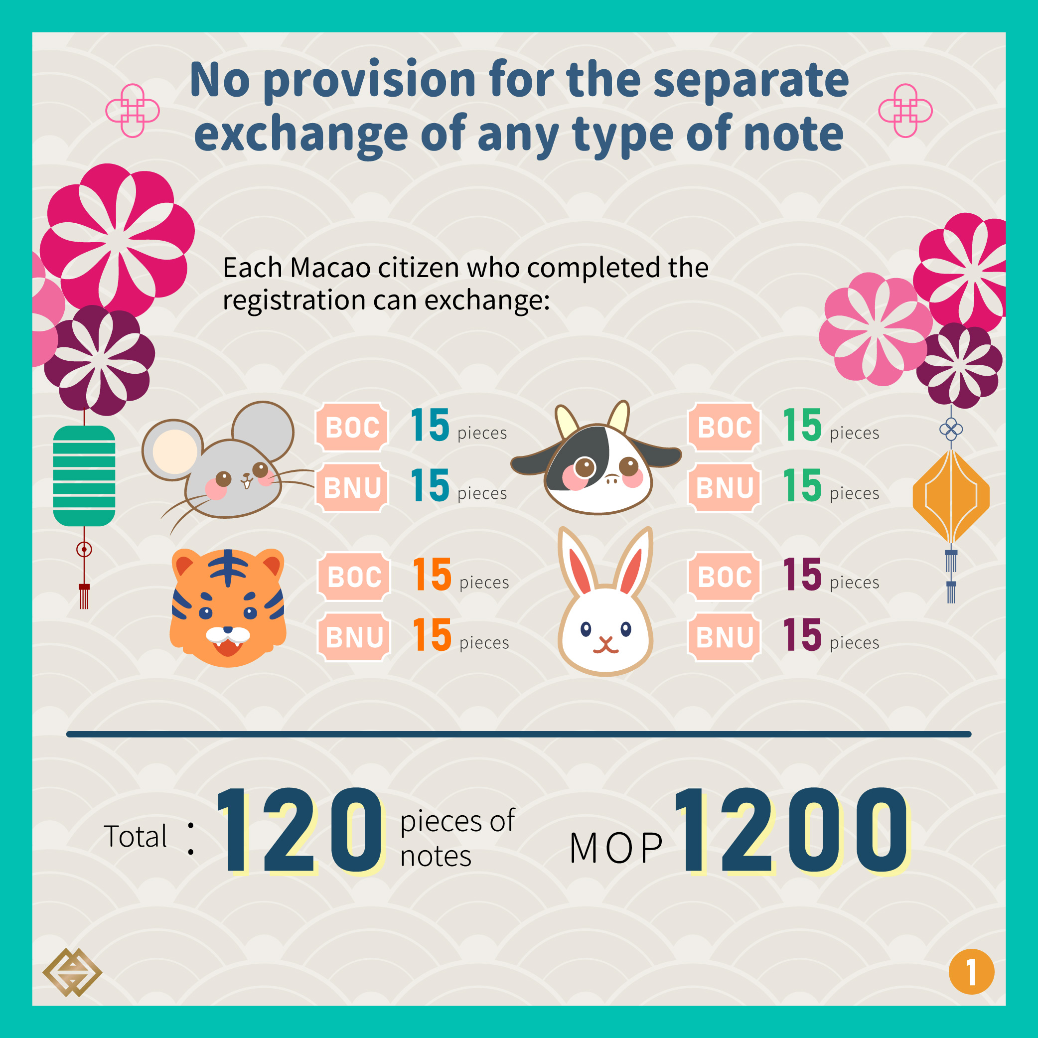 The exchange of four previously issued Zodiac Banknotes (including the Rat, Ox, Tiger and Rabbit Zodiac Banknotes) starts today (16 Sep) and will end on 6 December 2024. Each registered Macao resident can bring along his/her Macao ID card and funds to the selected bank on the chosen day and exchange for 15 pieces of the Rat, Ox, Tiger and Rabbit Zodiac banknotes of each Issuing Bank, totaling the exchange for 120 pieces of the mentioned banknotes with an exchange amount of MOP1,200.