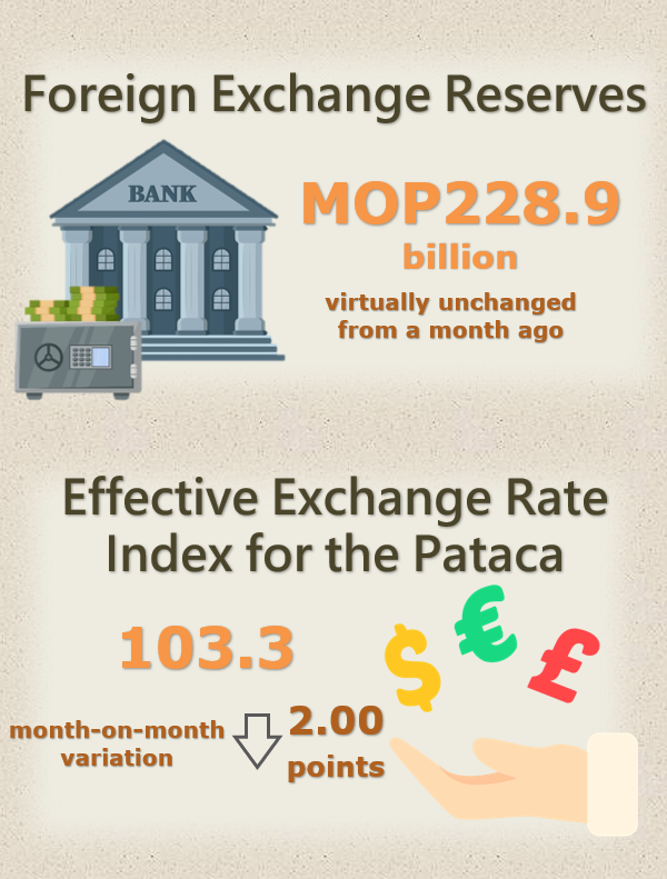 The trade-weighted effective exchange rate index for the pataca dropped 2.00 points month-on-month and 0.49 points year-on-year to 103.3 in August 2024, implying that overall speaking, the exchange rate of the pataca declined against the currencies of Macao’s major trading partners.