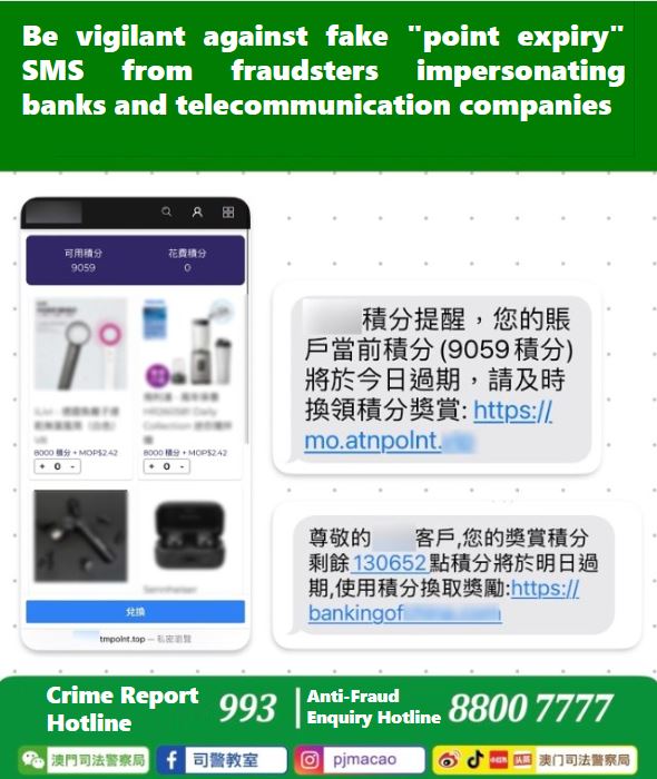 Recently, multiple residents have filed reports with the Judiciary Police (PJ), claiming that they had received fake SMS messages purportedly from local banks and telecommunications companies. These SMS alleged that the customer’s points were about to expire and lured them to click the link embedded in the message. Upon clicking the link, they were redirected to a bogus webpage mimicking the bank or telecom provider’s websites. To redeem gifts at a low price, residents were instructed to enter their credit card details, which scammers later used for large, unauthorized transactions.